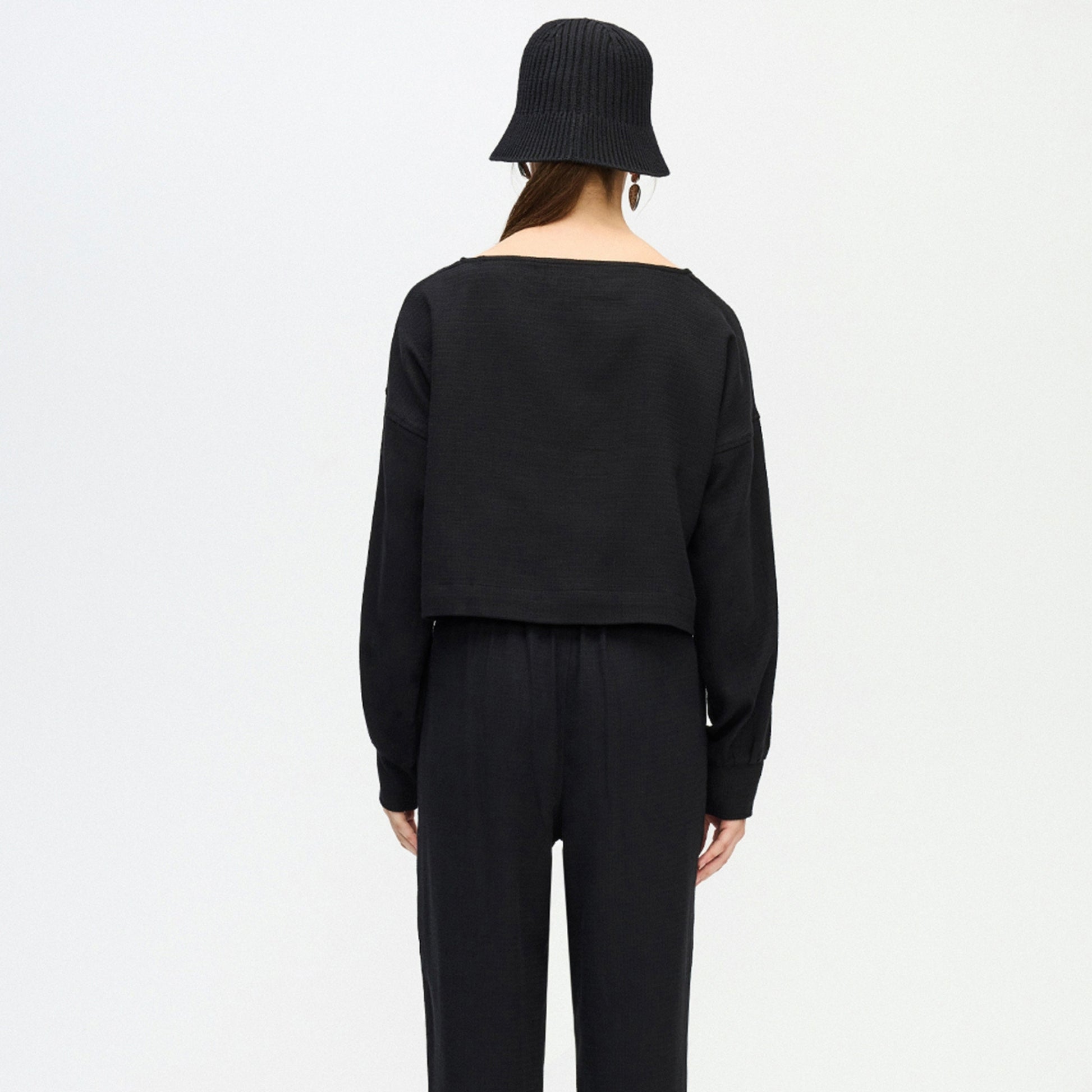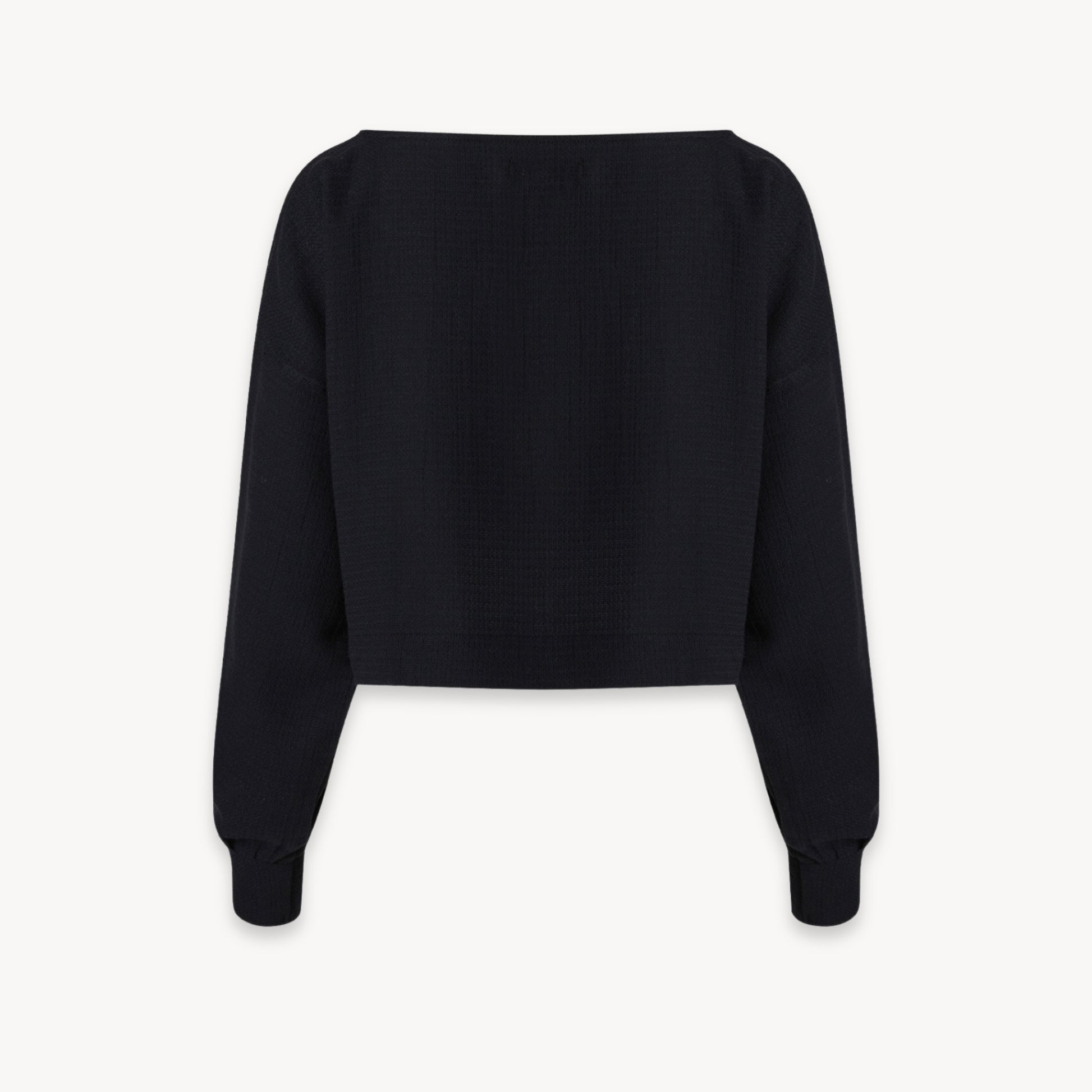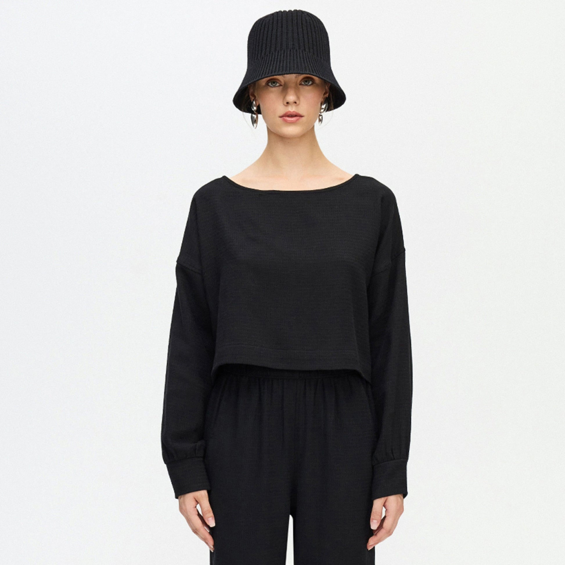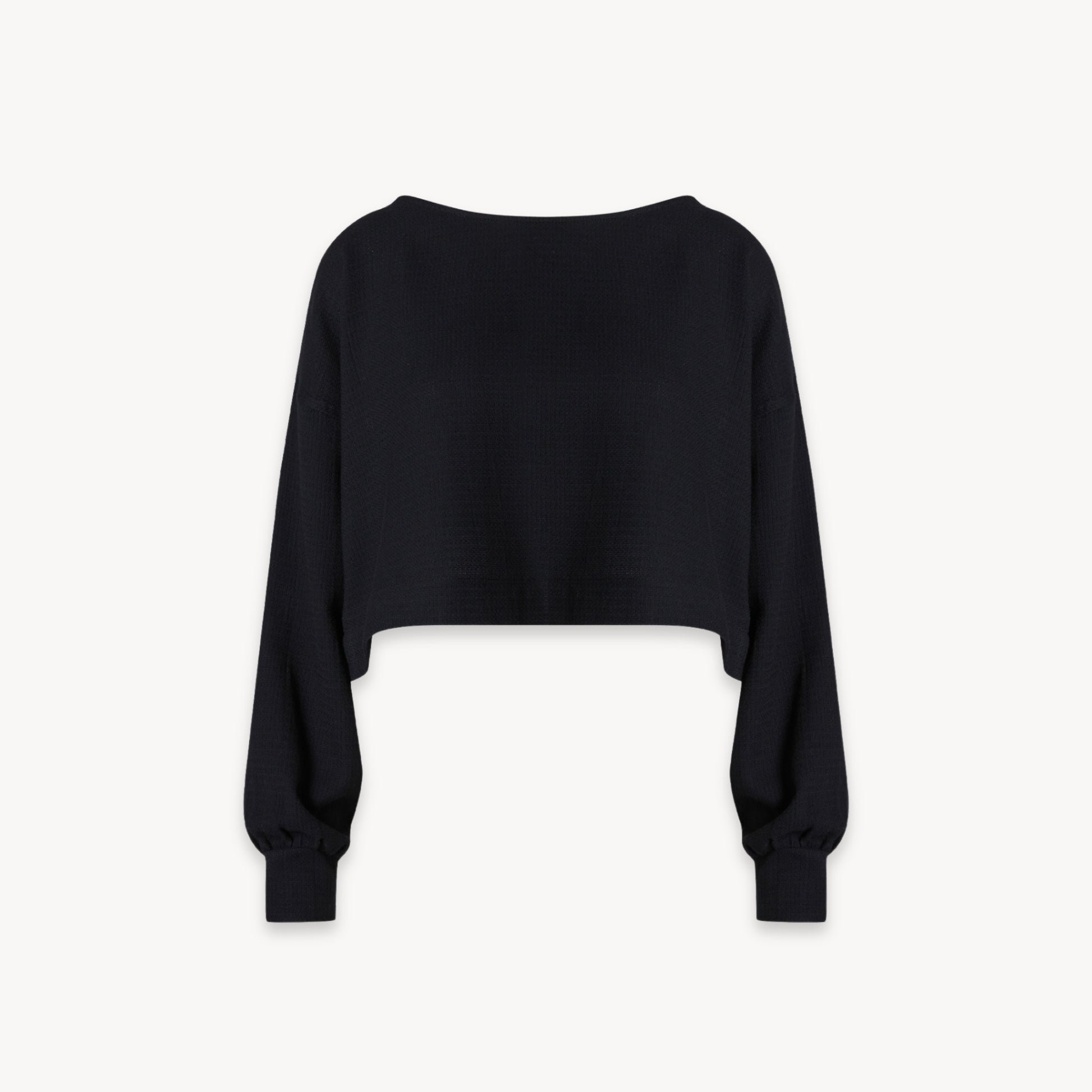 The Flat Black Crop Blouse is a long cuffed style sleeve, with a boat neckline and cropped top length. Pair with the Flat Black Slouchy Pants for a full outfit.