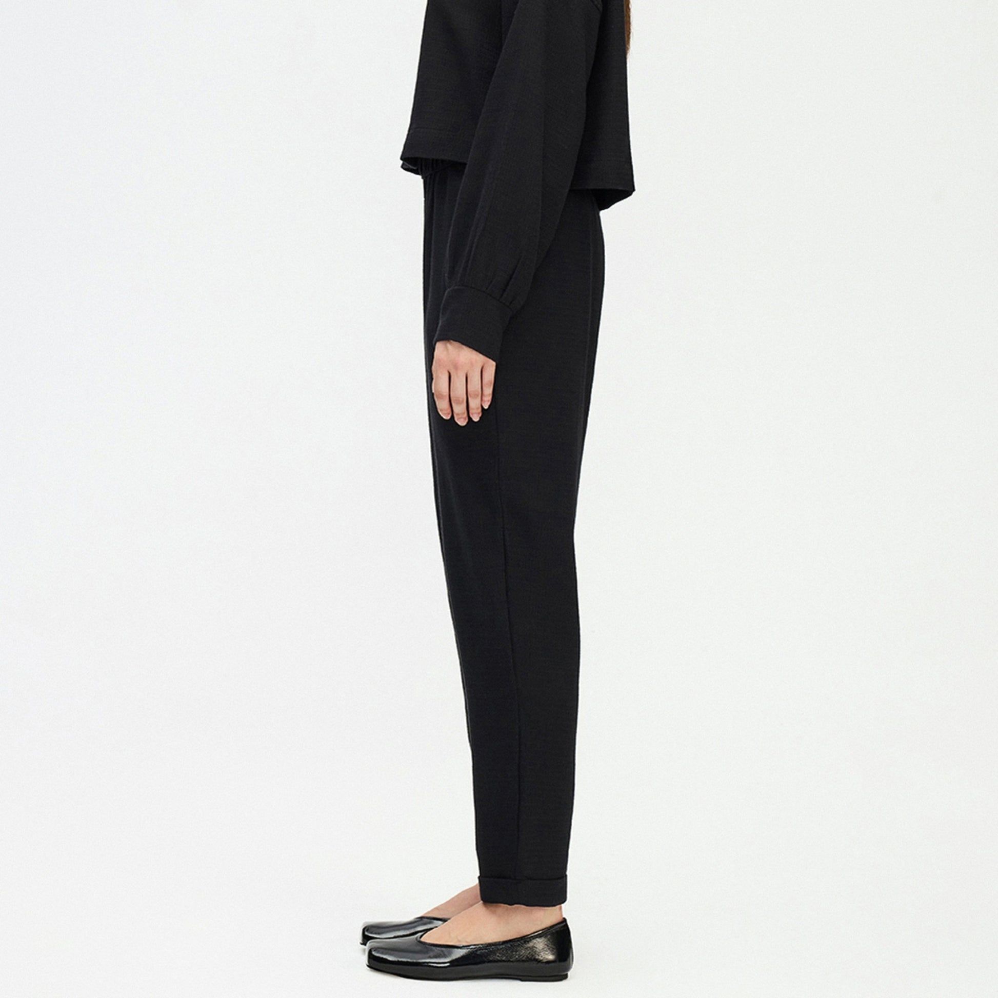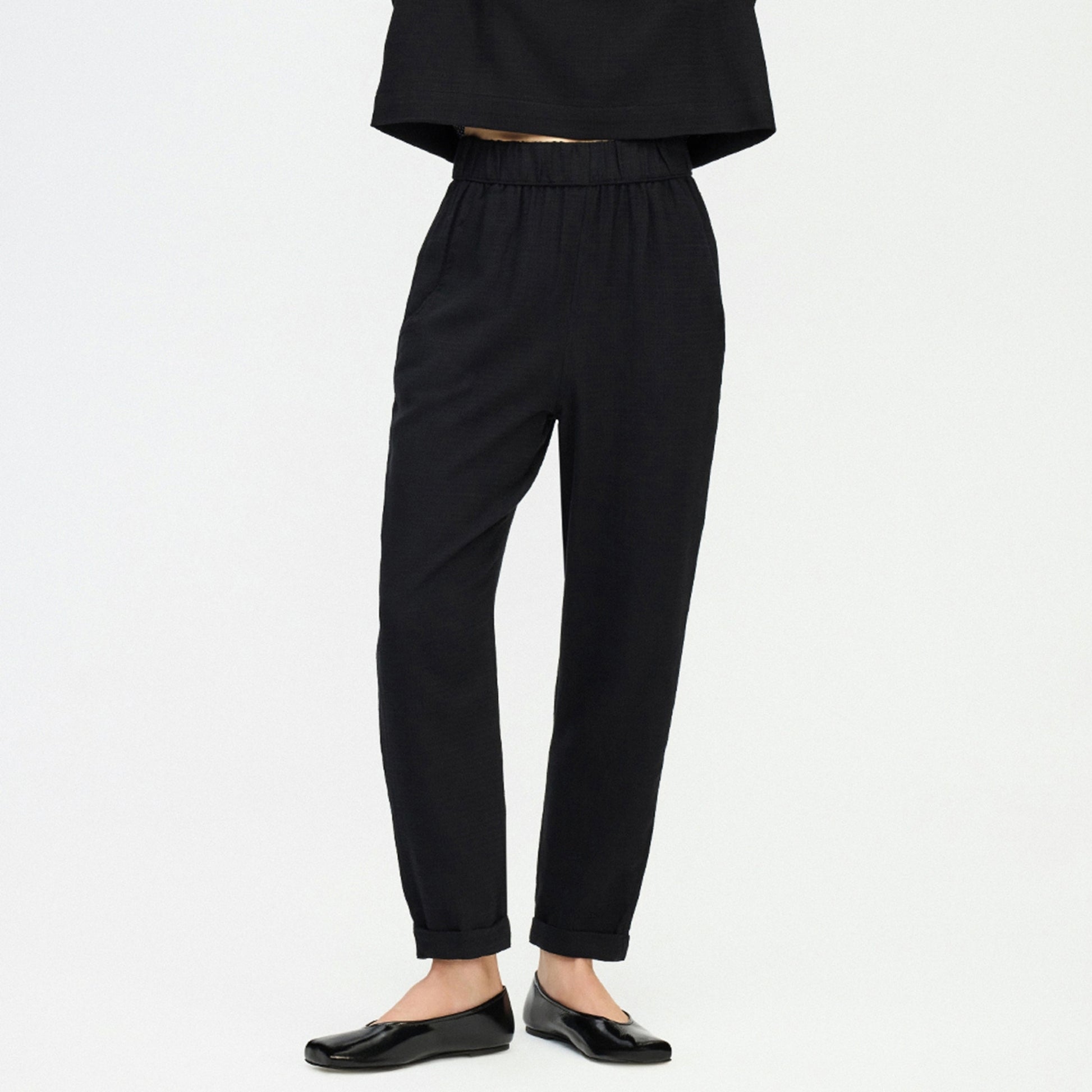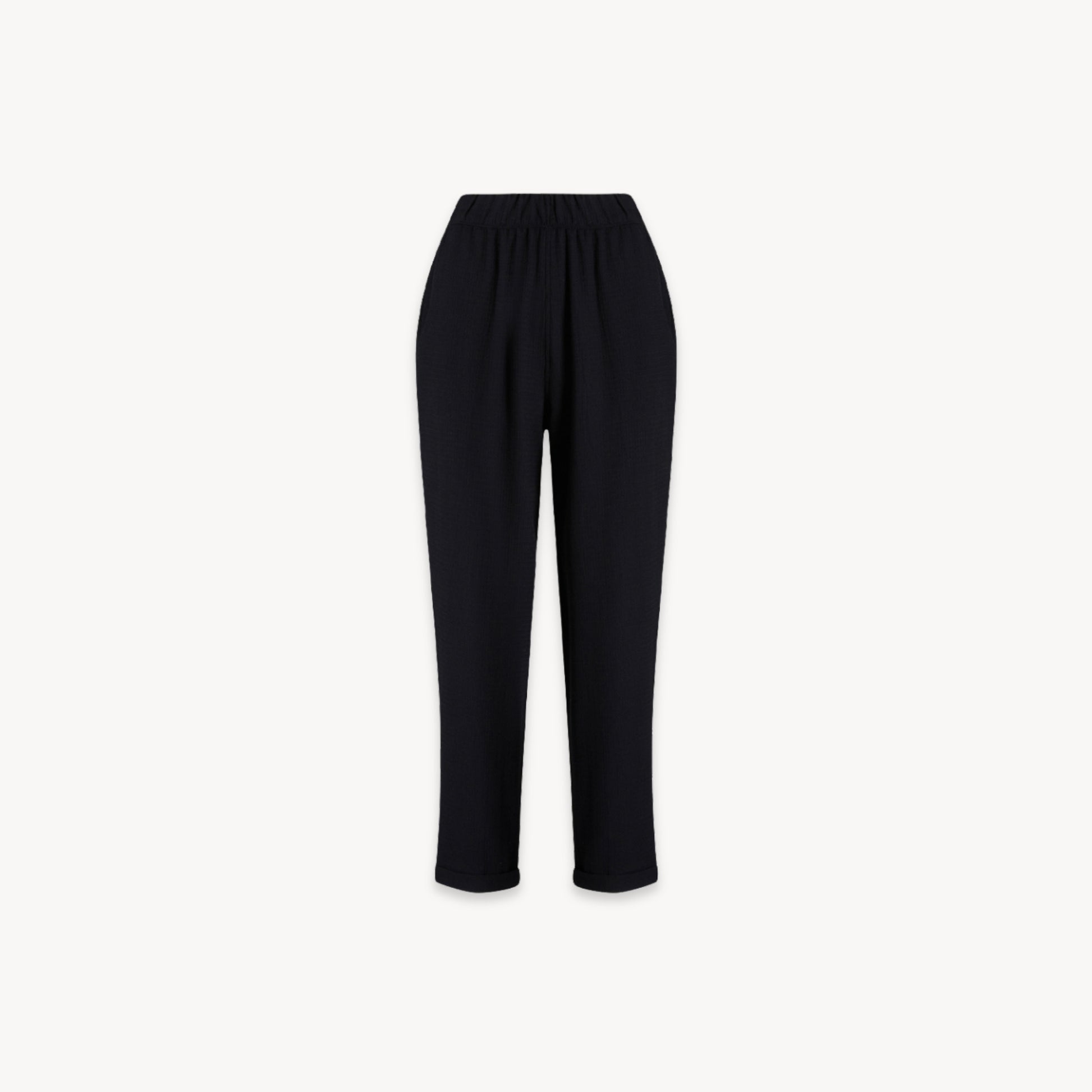 The Flat Black Slouchy Pants are an ankle-length, tapered fit with a stretch waist and 2 side pockets. Pair with the The Flat Black Crop Blouse for a matching set.