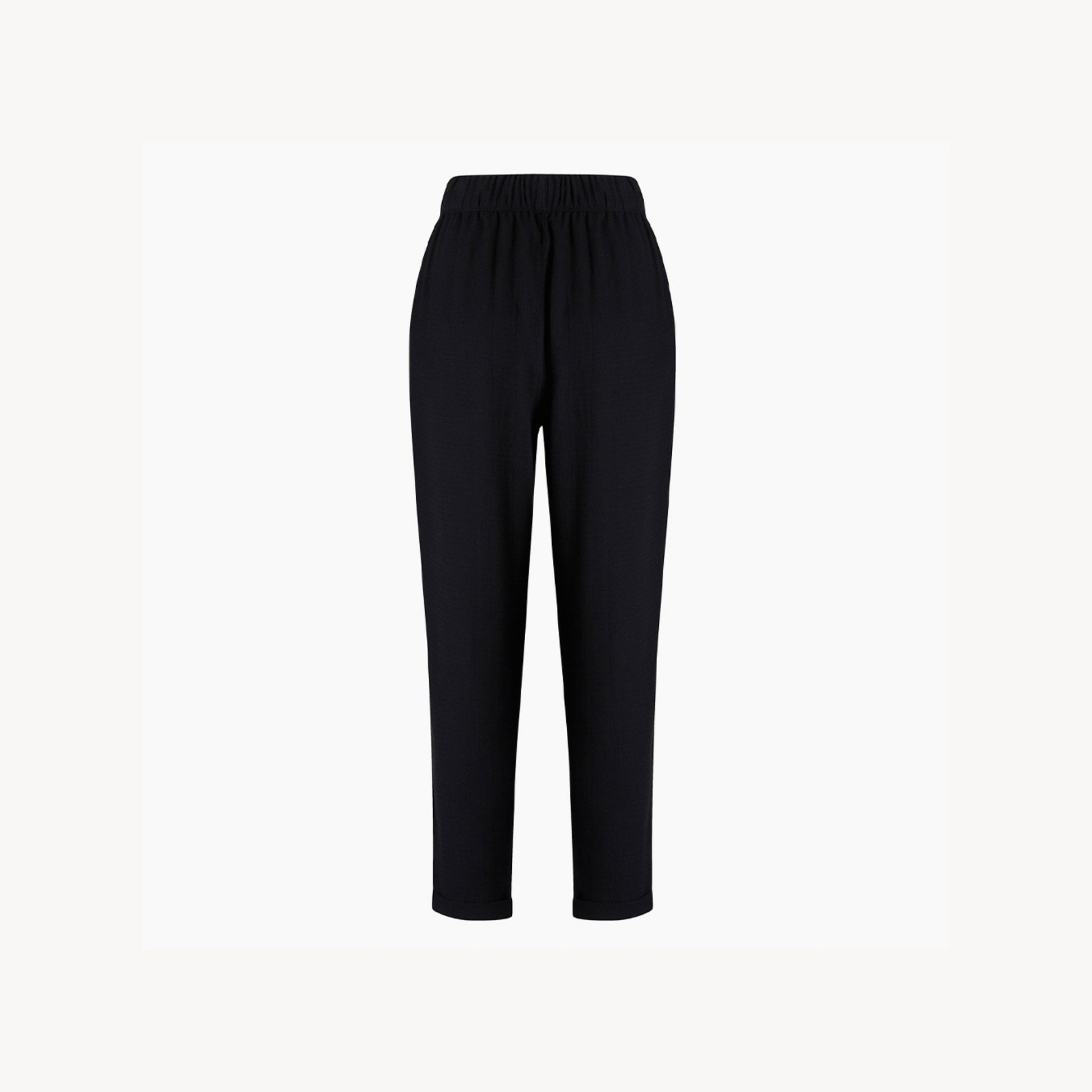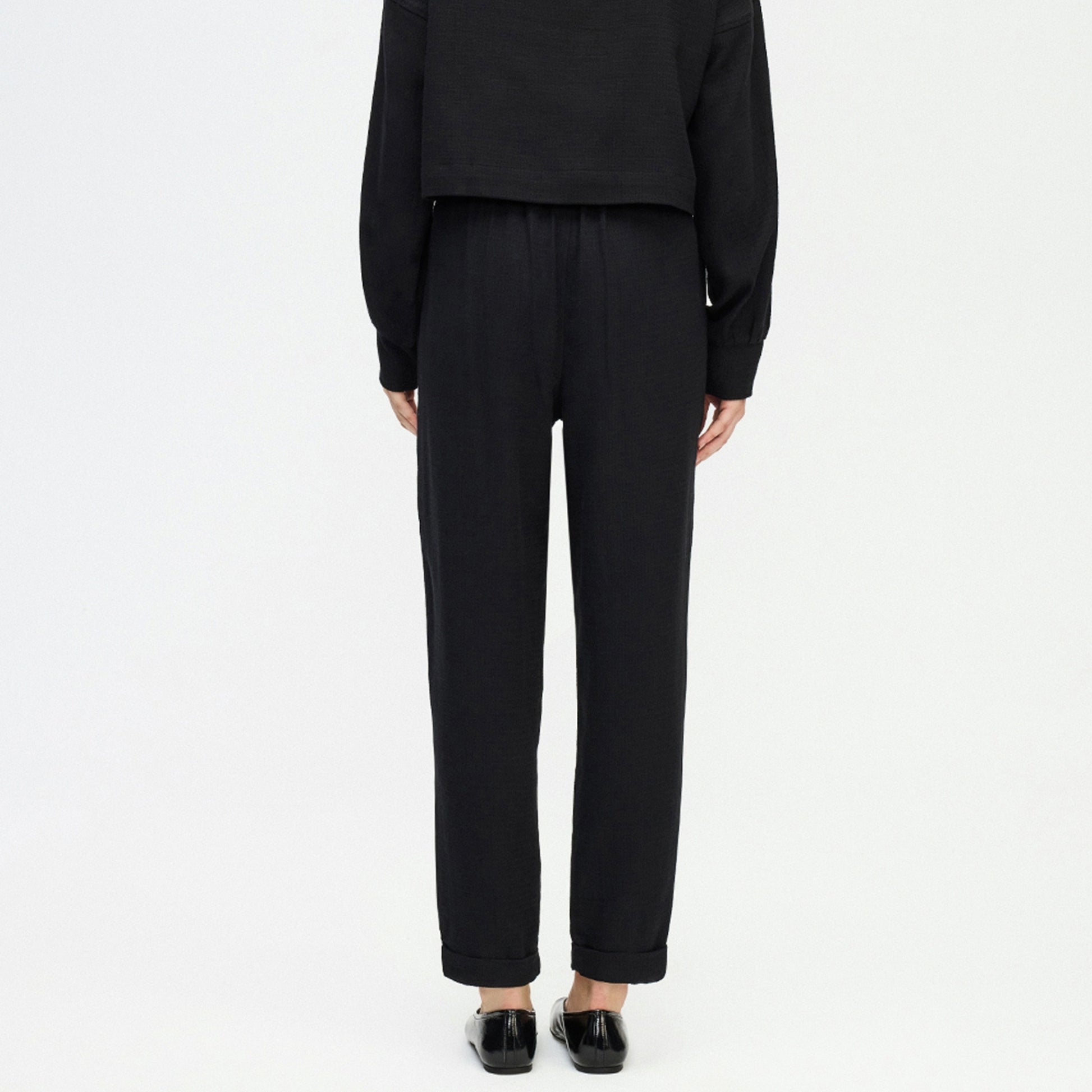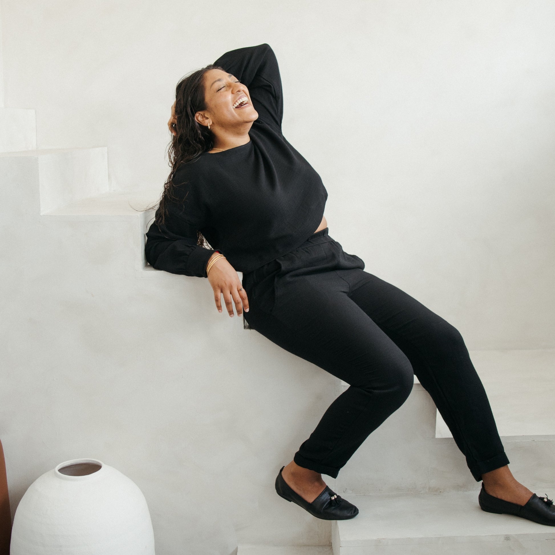 The Flat Black Slouchy Pants are an ankle-length, tapered fit with a stretch waist and 2 side pockets. Pair with the The Flat Black Crop Blouse for a matching set.