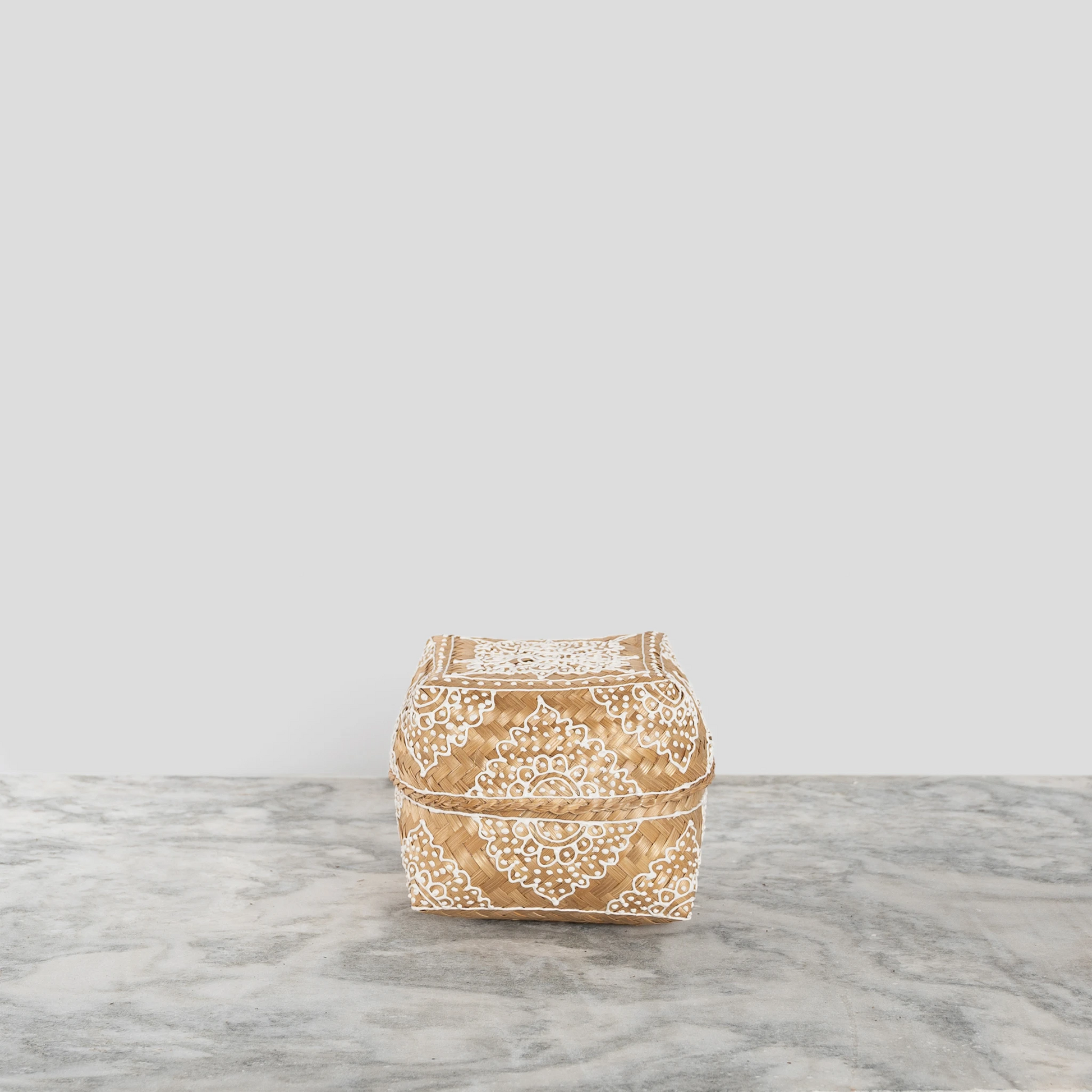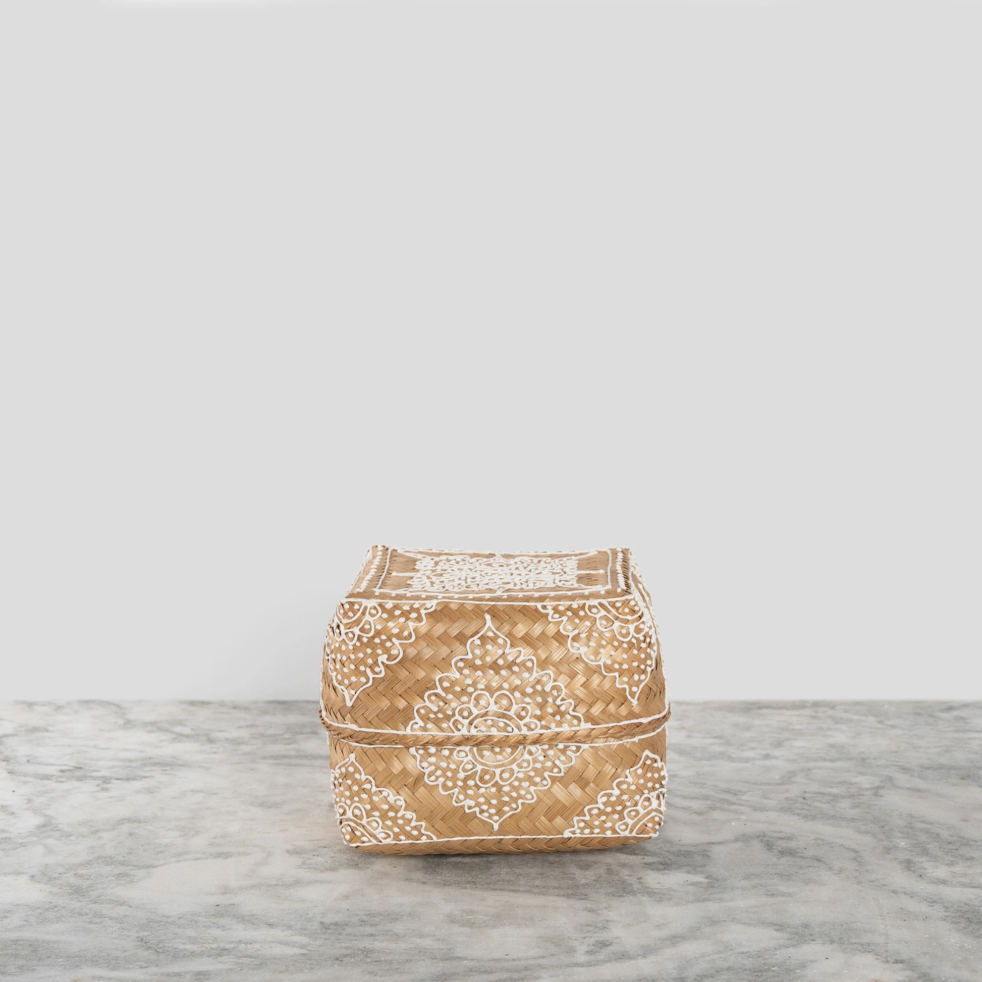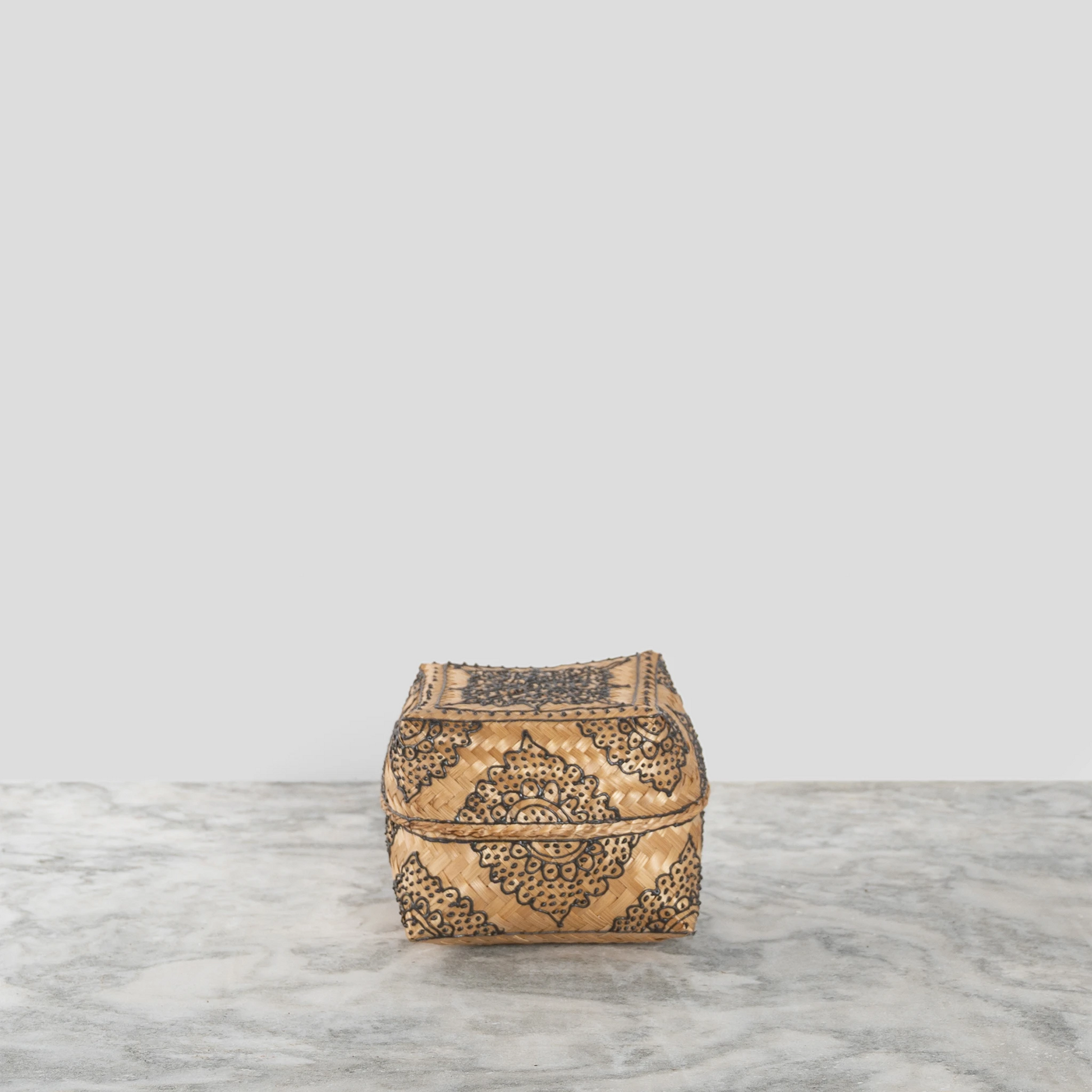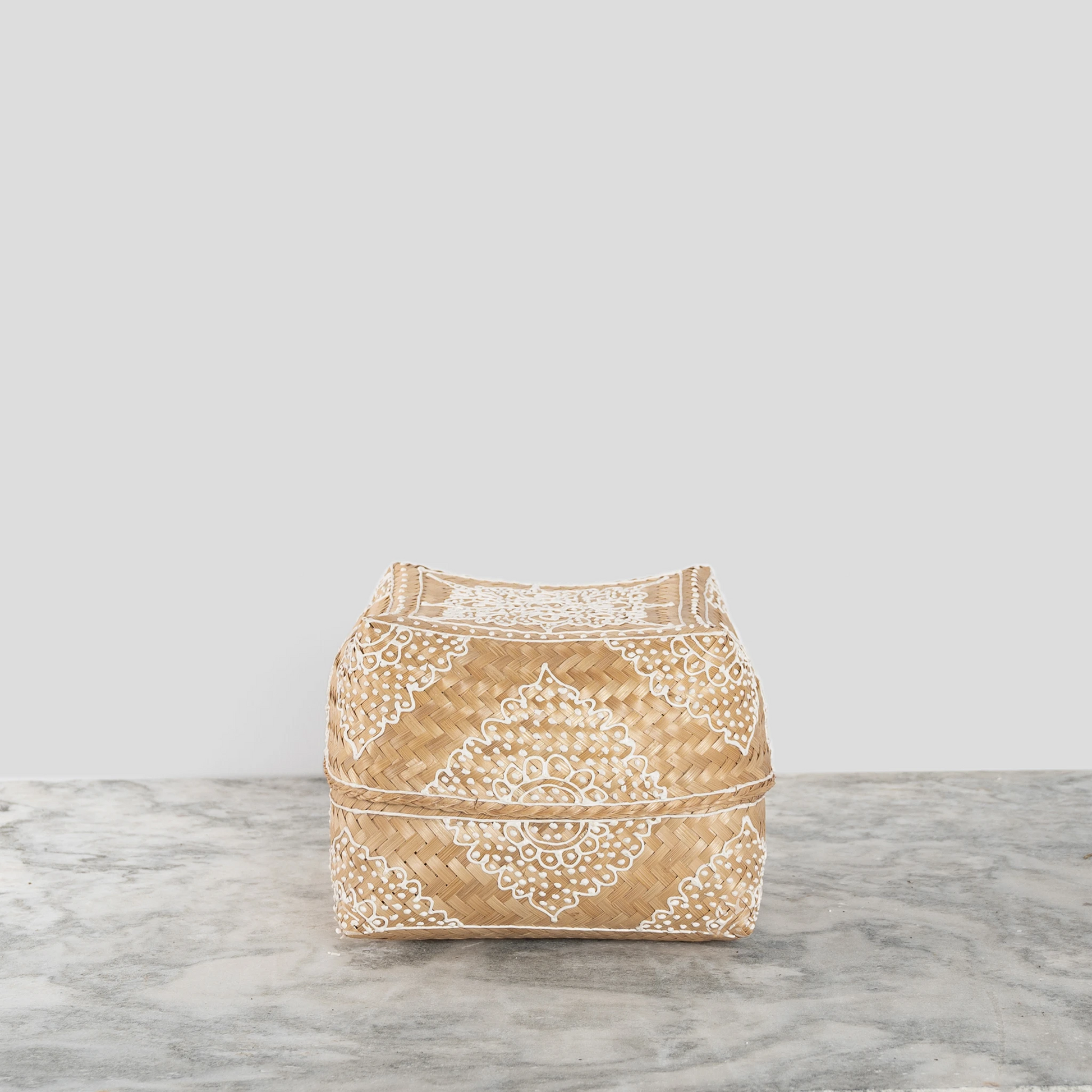 These trays and baskets with lids are beautifully woven and they’re very sturdy. The hand done decorations mandala are exquisite. They’re lovely as decorations and have many uses.