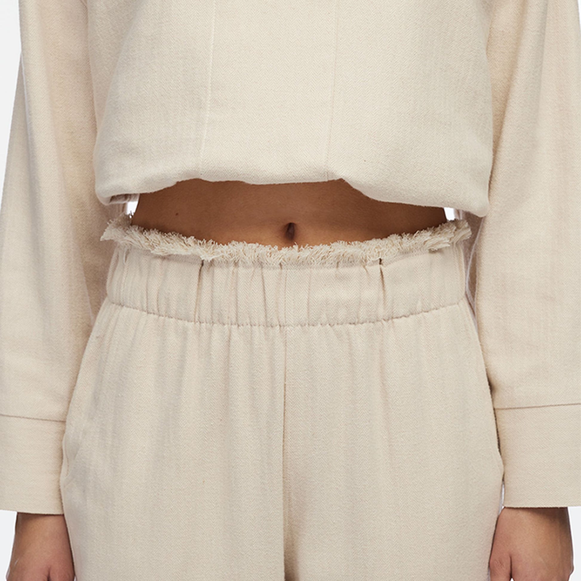 These pants feature 2 front pockets, a cargo side pocket, and an elastic waistband with raw edge detailing. The fit is higher waist, and the pant length falls to about the ankle. Hems can be rolled to adjust length.