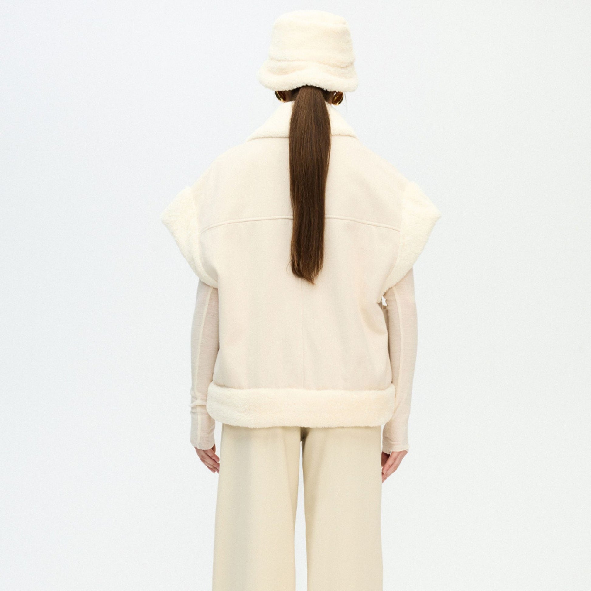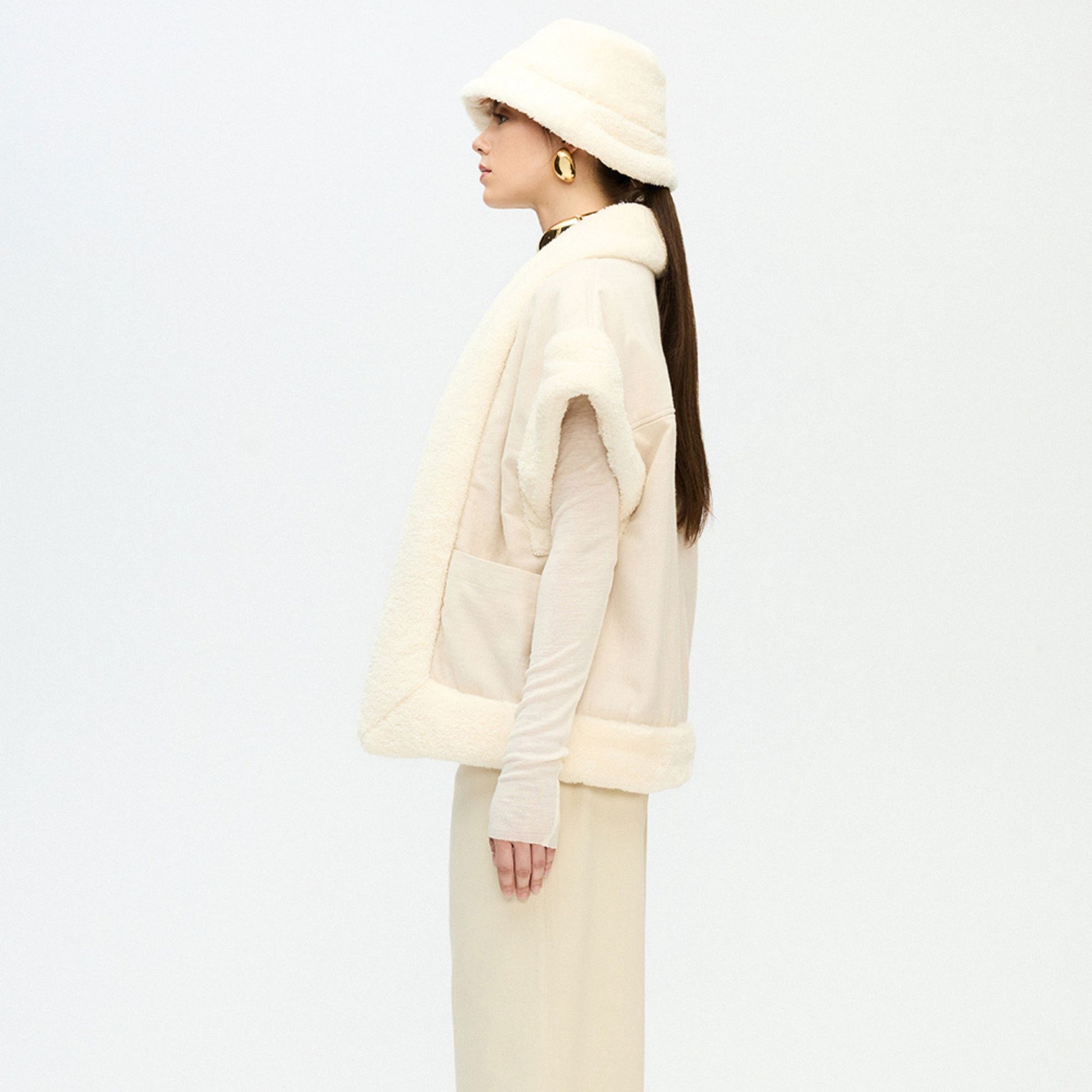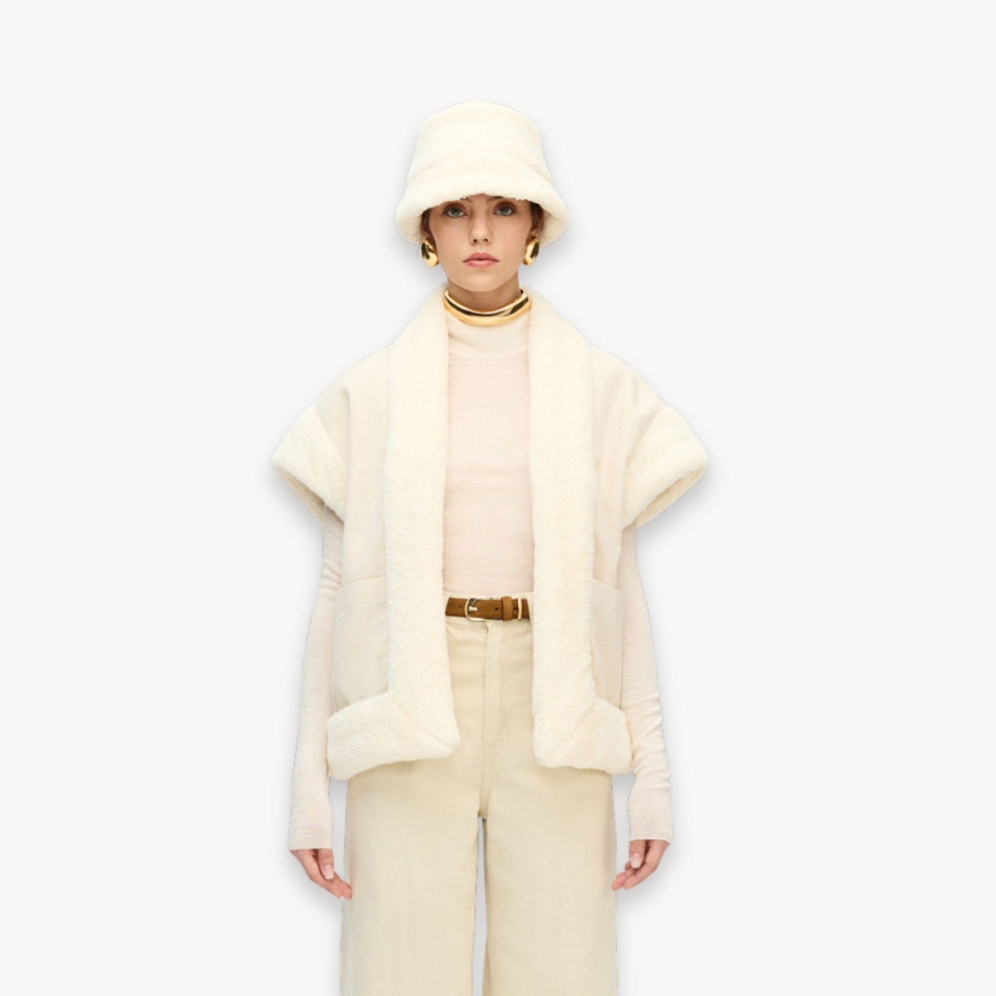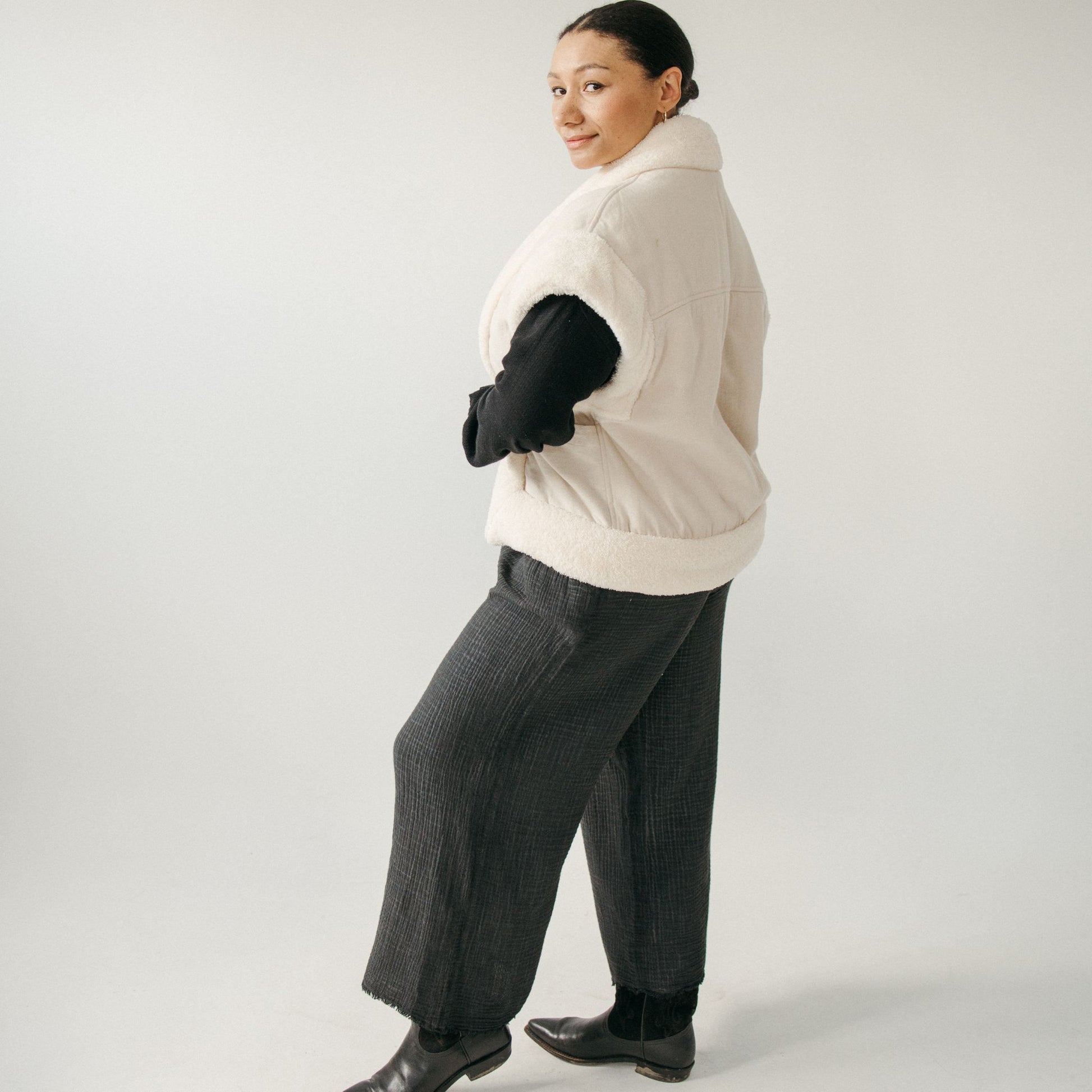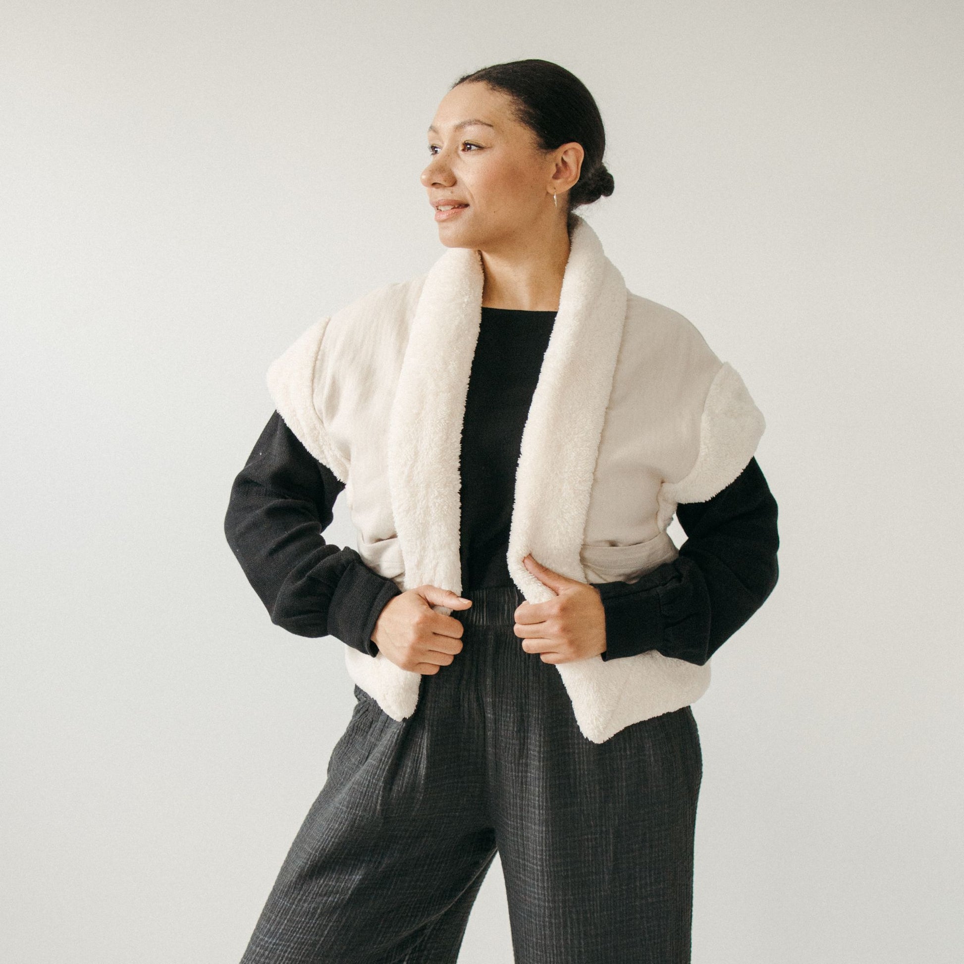 The Herringbone Sherpa Vest is a short sleeve, with 2 side pockets, an upcycled sherpa fleece lined hem collar. Perfect as an autumn layer or pair with bottoms of our Herringbone Collection for the perfect set.