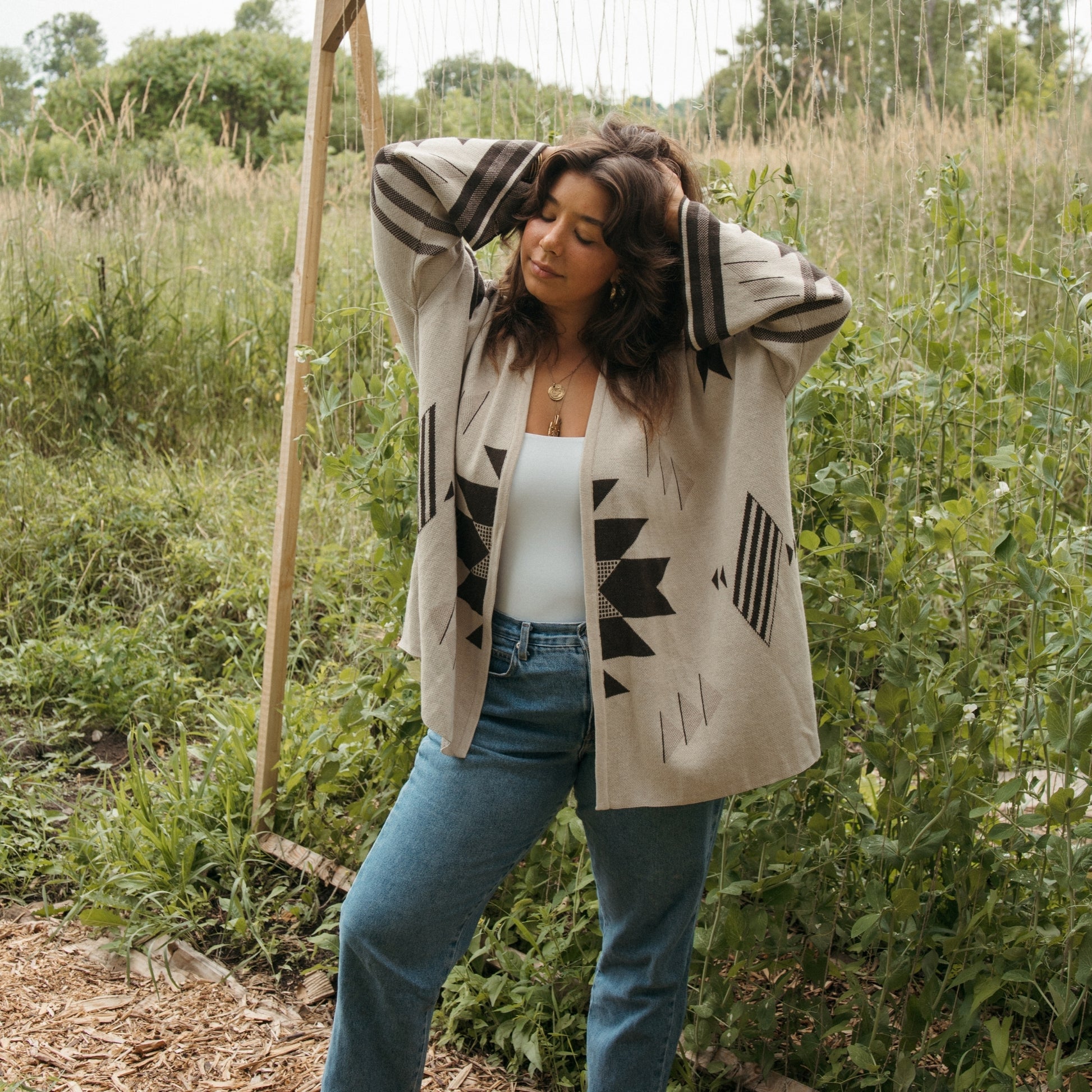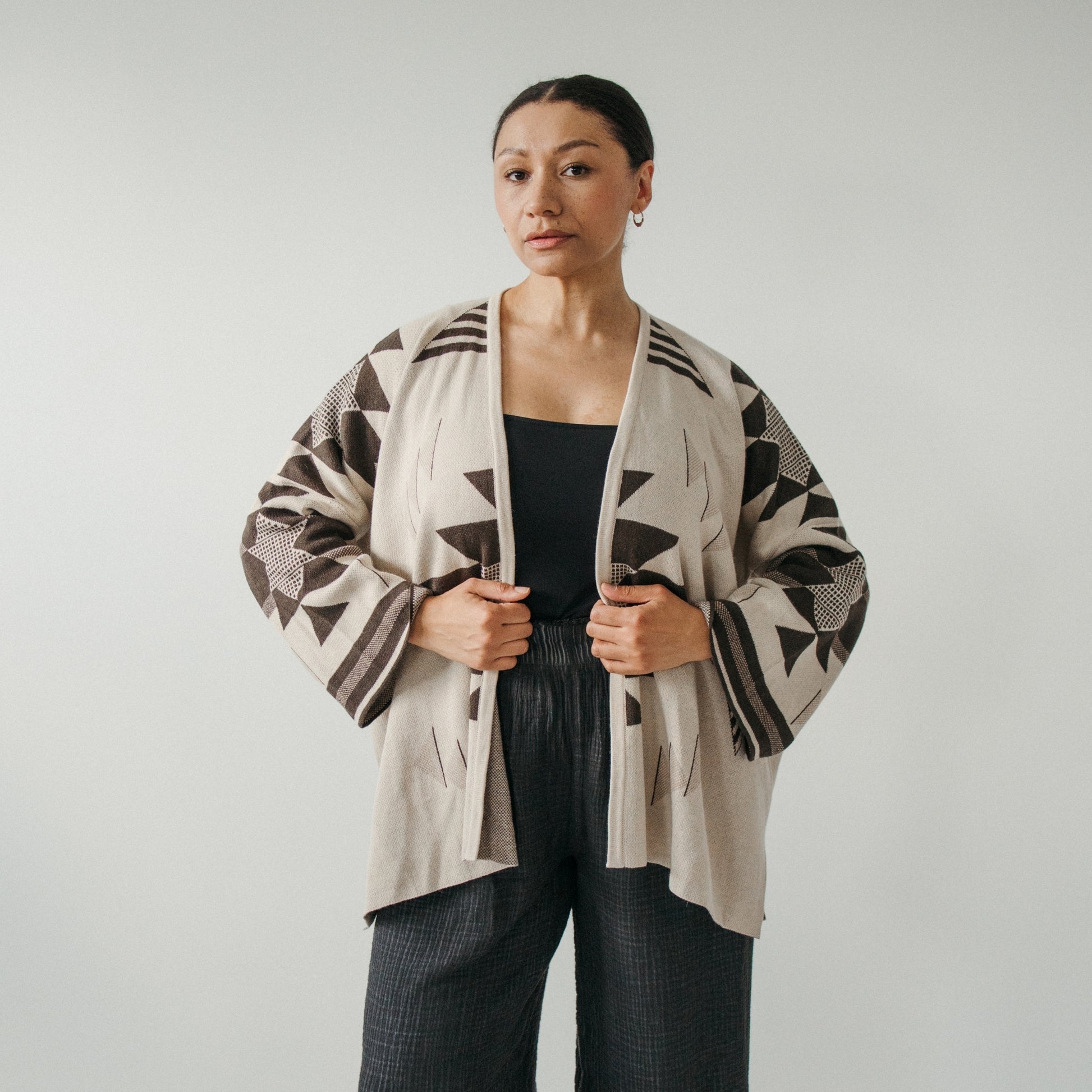 This is an elevated basic, an authentic little luxury and will last for years to come in any capsule wardrobe. The Jacqueline Jacquard Sweater is a classic one-size-fits-most open cardigan that comes to the hip and has a bell sleeve. Made with a Peruvian alpaca which is warmer than wool, and less itchy.