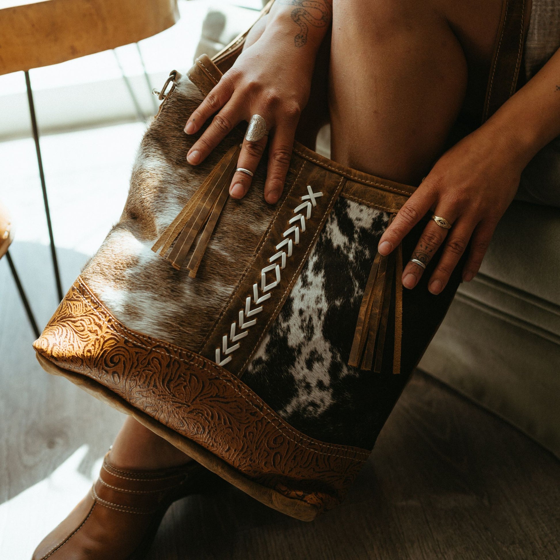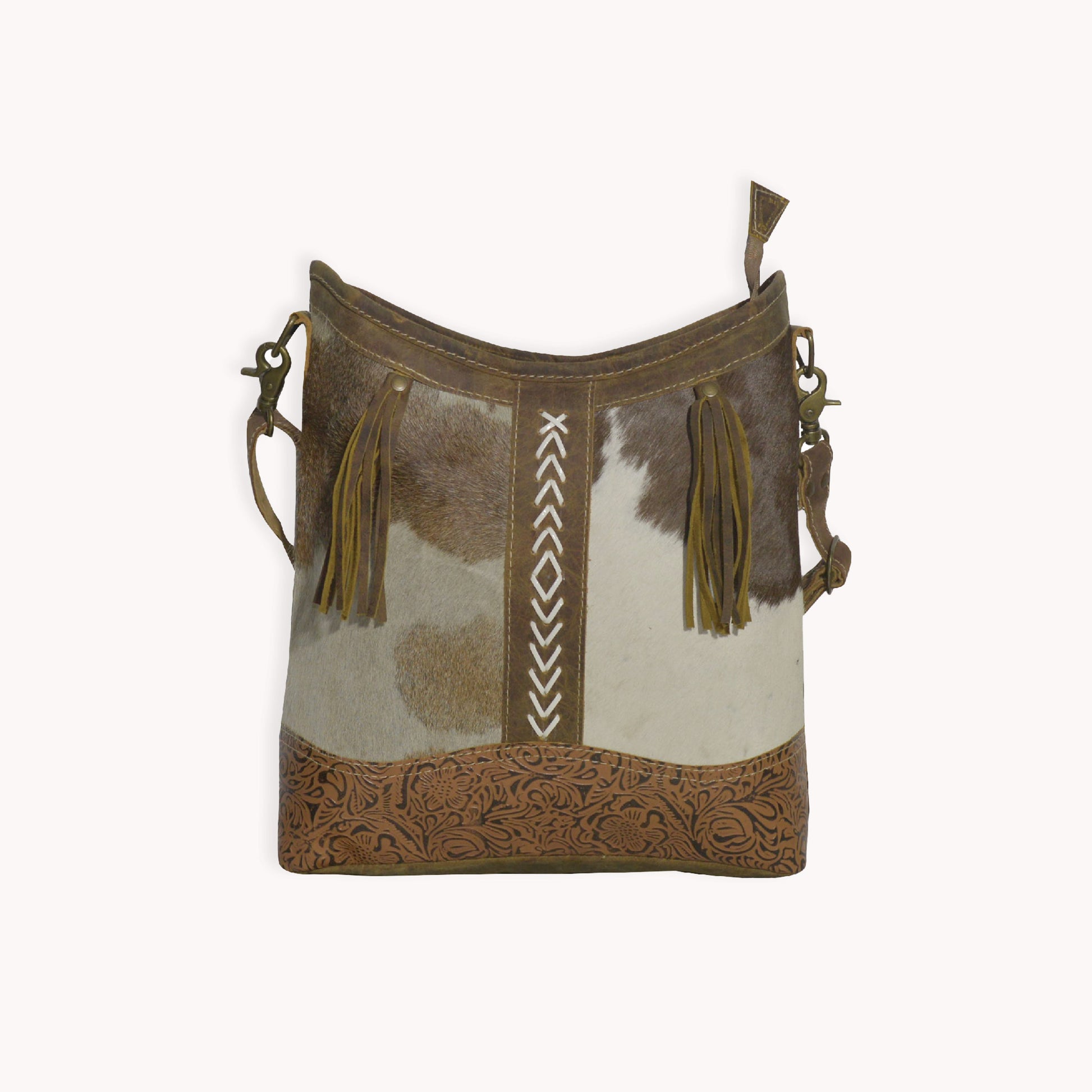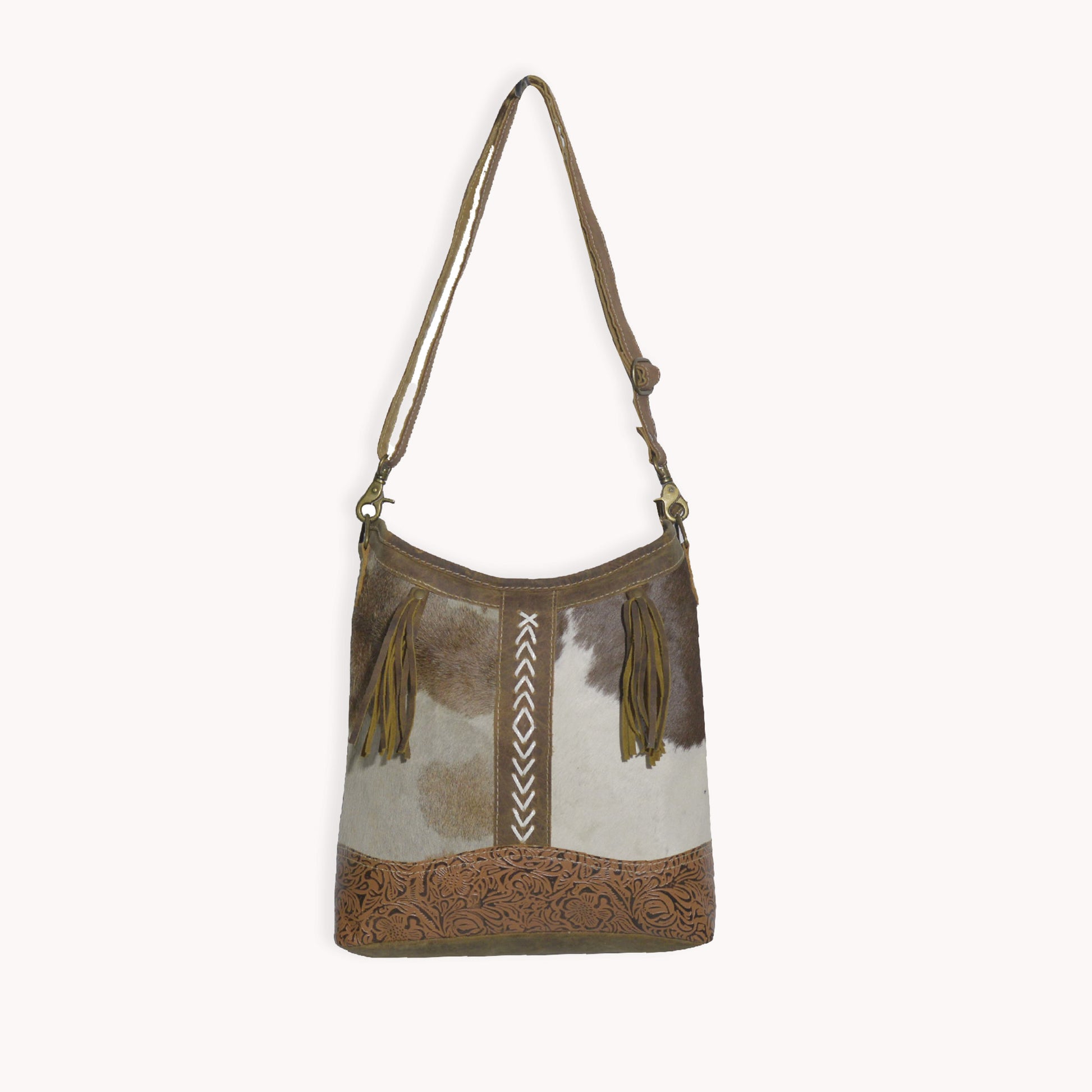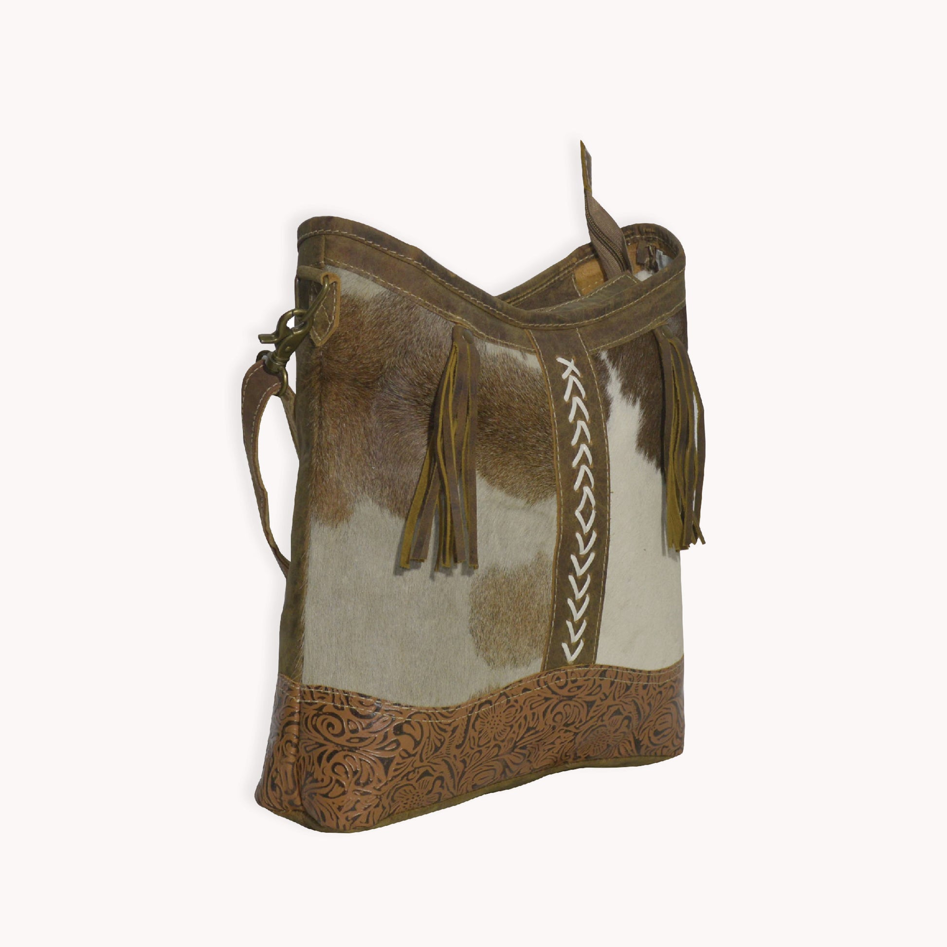 Bag made up of cotton rug, canvas and buff leather & hairon with brass hardware accessories |