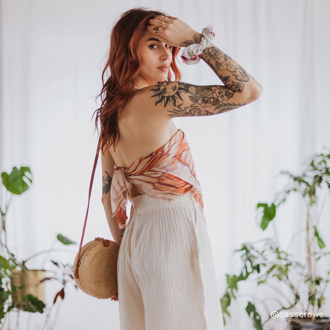 This scarf is so pretty. The fabric is light but not flimsy - perfect for spring and I’m sure I’ll wear it a ton in the summertime too. I’ve been wearing it a lot with a denim jacket as things start to warm up. I’m an XL and it is great as a top on me too. Love that it works for a range of sizes when worn as a top and of course it’s beautiful as a scarf!