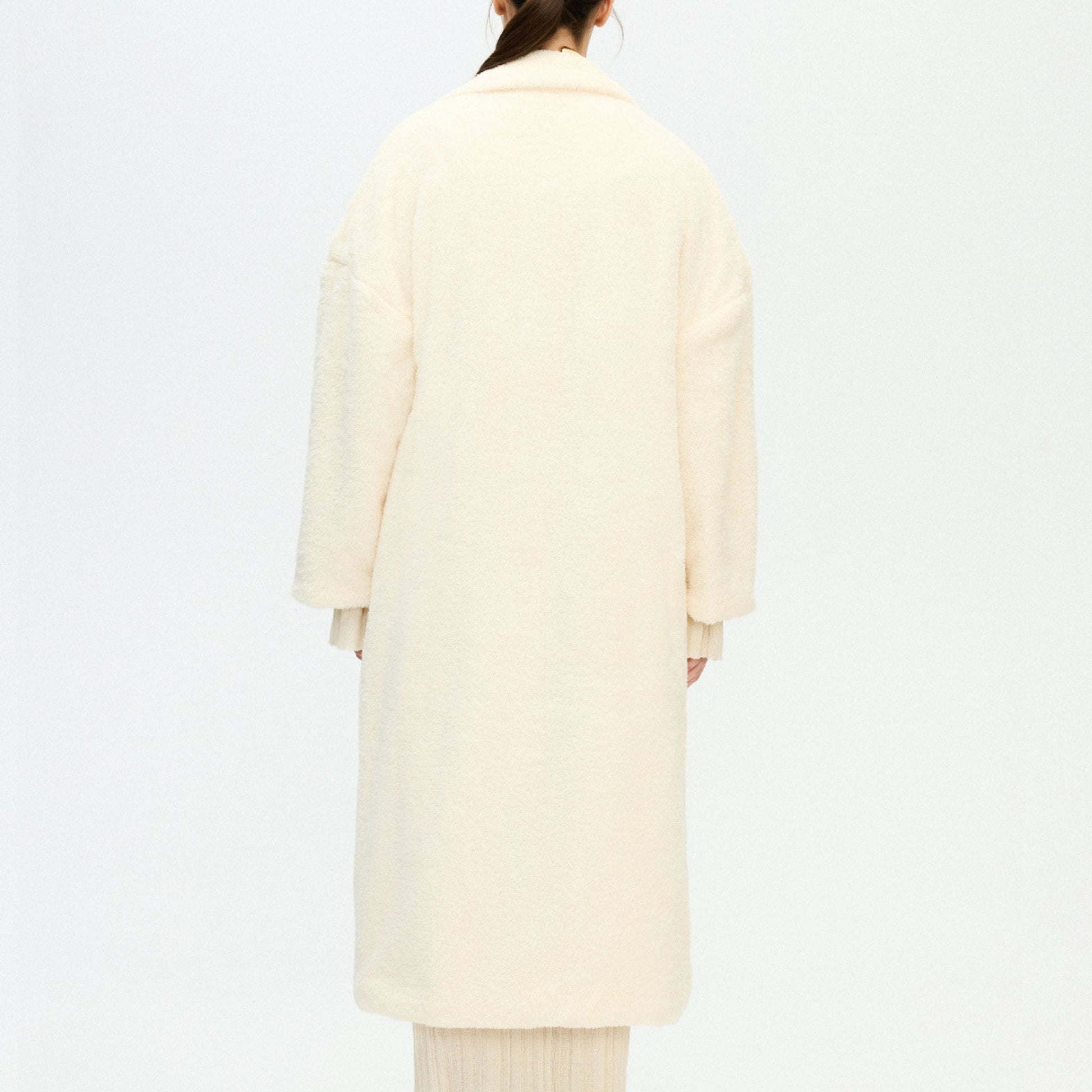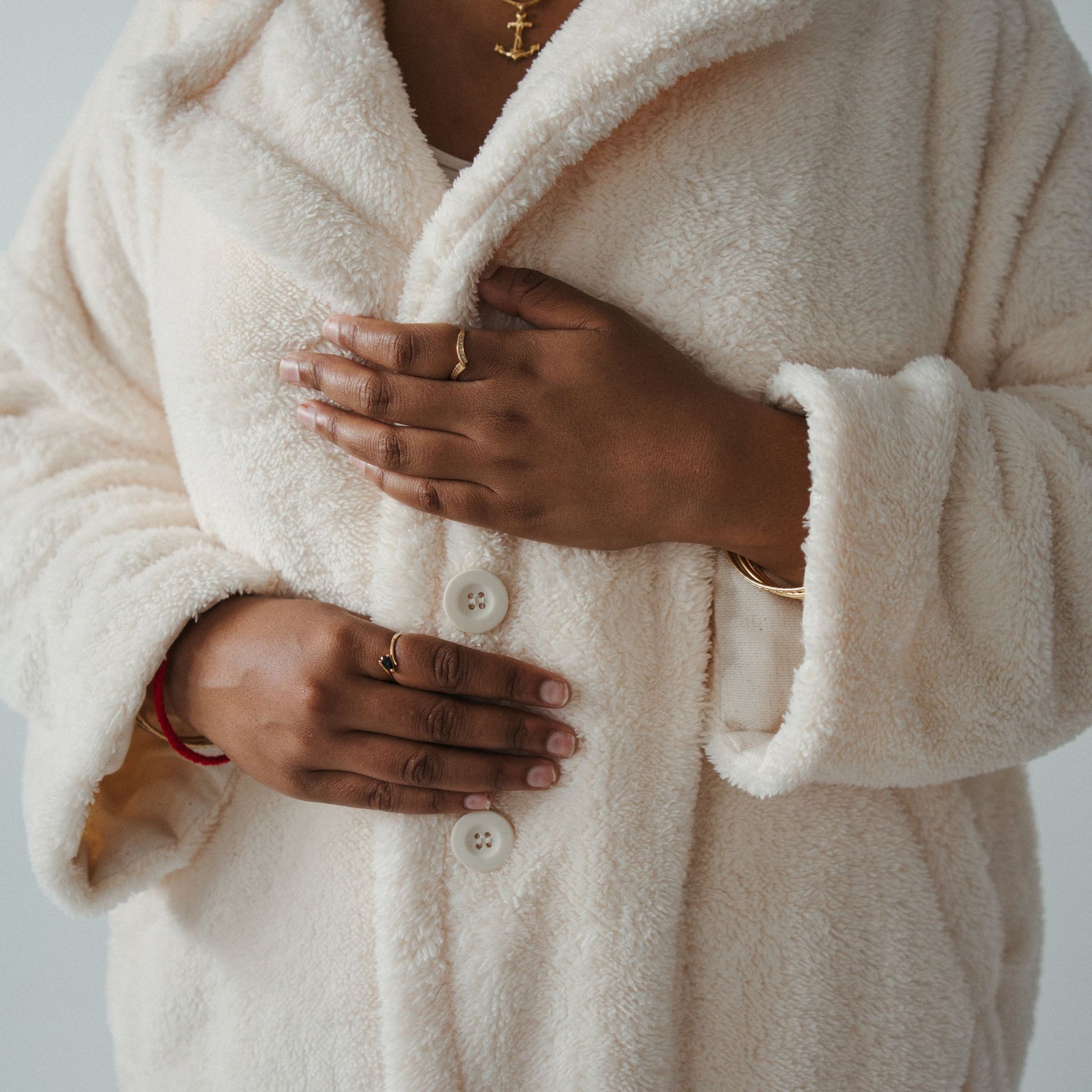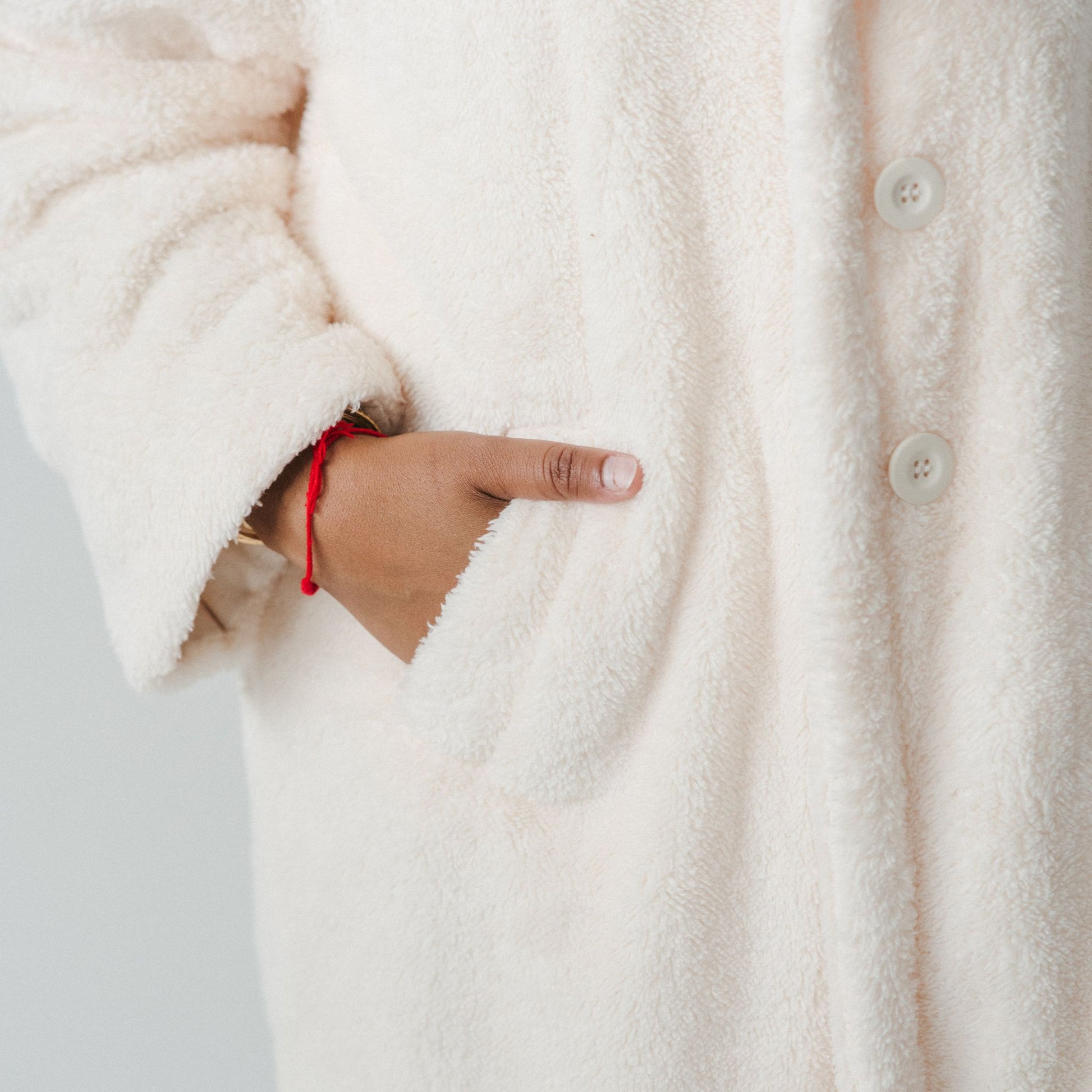 The Recycled Long Sherpa Jacket is long sleeve, with 2 side pockets, and a mid-calf length jacket made from 100% recycled poly sherpa. Perfect as an autumn layer or pair with bottoms of our Herringbone Collection for the perfect set.