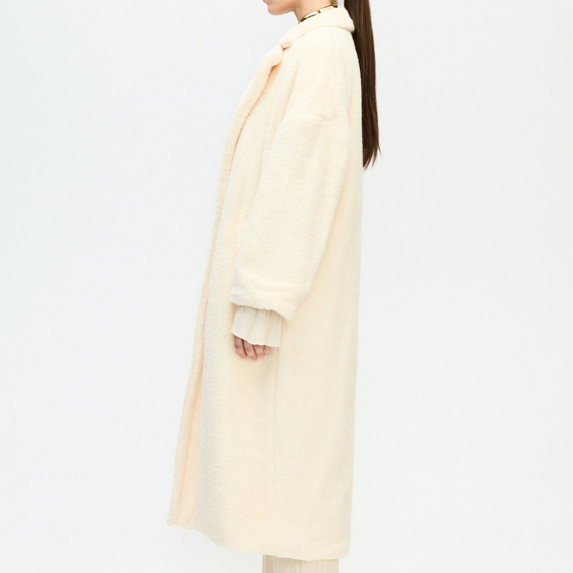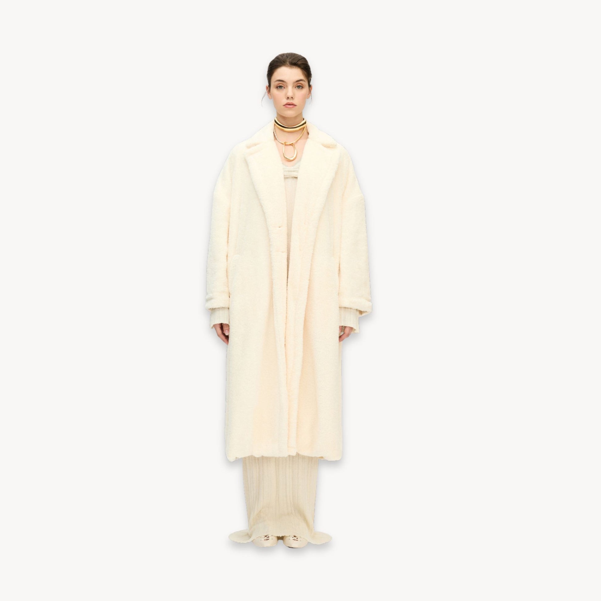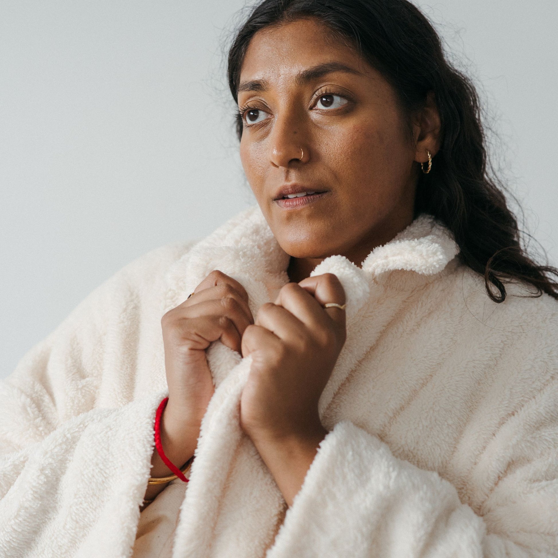 The Recycled Long Sherpa Jacket is long sleeve, with 2 side pockets, and a mid-calf length jacket made from 100% recycled poly sherpa. Perfect as an autumn layer or pair with bottoms of our Herringbone Collection for the perfect set.
