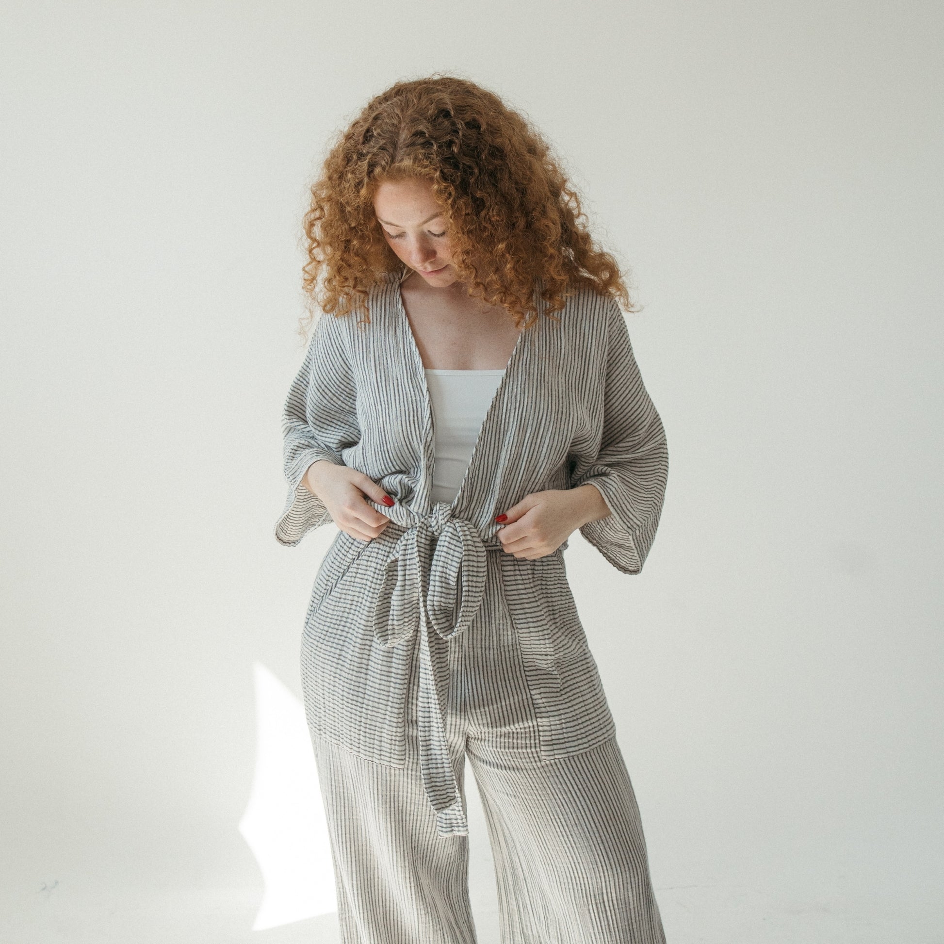 The Crinkle fabric is made with a natural fibre blend which offers a vintage-distressed look. Each piece may vary slightly in colour, adding to its organic, artisanal charm. Whether paired with jeans for a laid-back look, or paired with our matching pants from our Crinkle Apparel Collection for a graceful, ethereal look. With a relaxed fit, this top ensures freedom of movement and a gentle touch of nature with every wear.