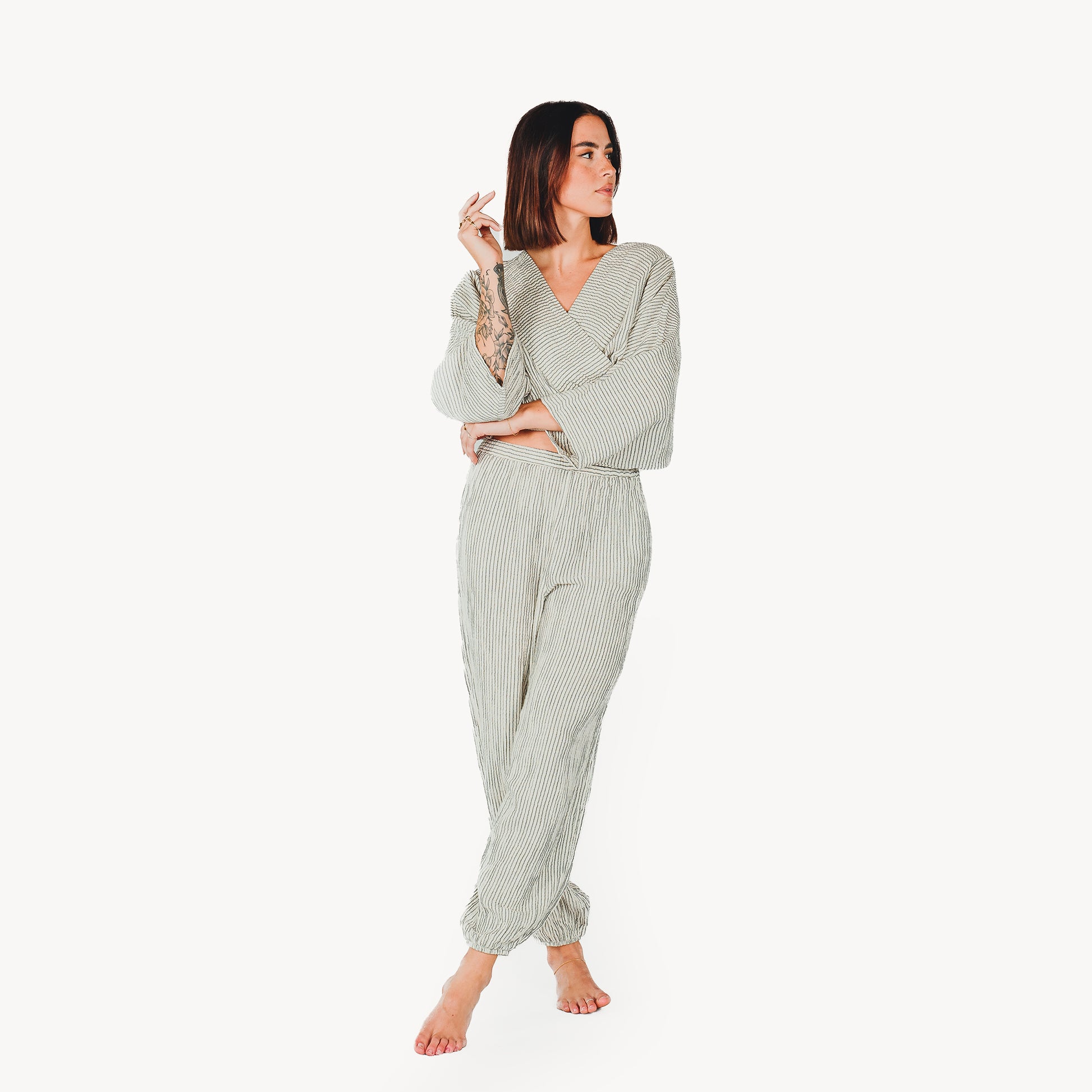 The Striped Crinkle Cotton Apparel is designed to comfortably fit most bodies sized S, M, and L, though it can be comfortable on smaller and larger bodies outside of this size range. Note that sizing may slightly vary through the sustainable garment-dyeing process. |