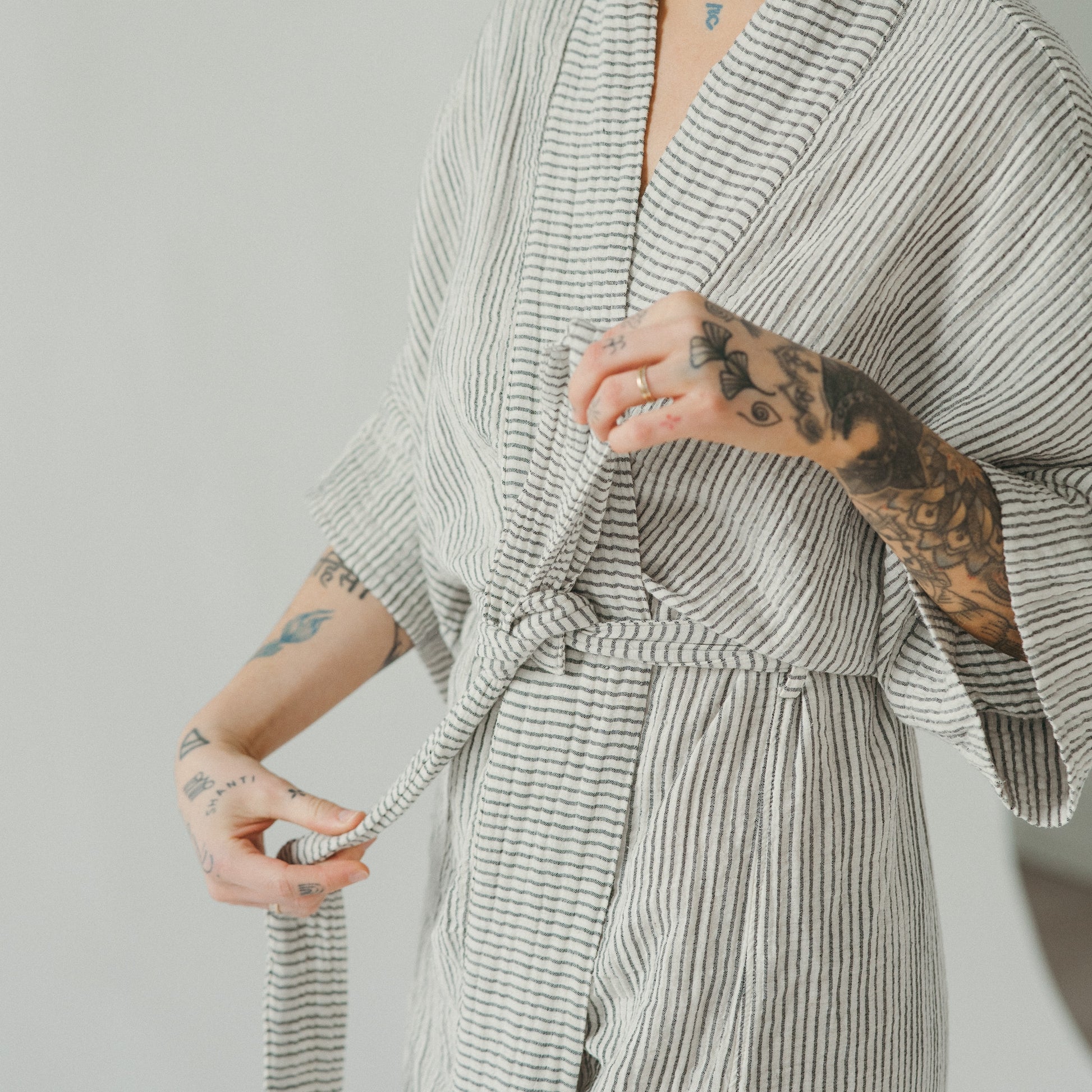 For a garment worn by most of us daily, the quality and comfort of your favourite robe should be nothing but the best. Choosing natural and sustainably sourced fabrics ensures a sensory friendly experience that’s free from harmful chemicals and irritants. The Crinkle texture adds depth to a classic design, while the side split skirt allows for freedom of movement. The half-length, wide cut sleeves offer an airy, graceful finish