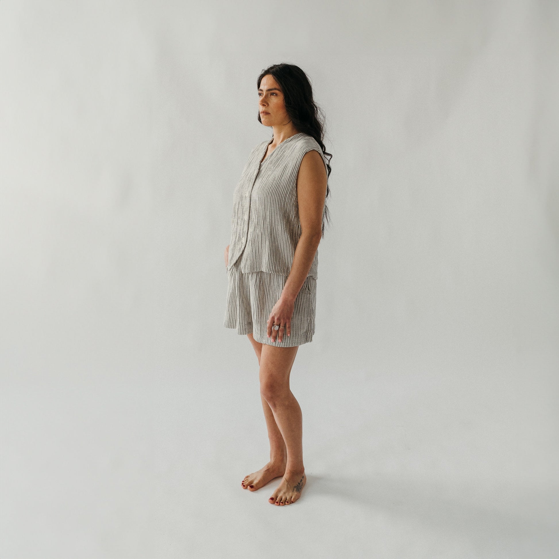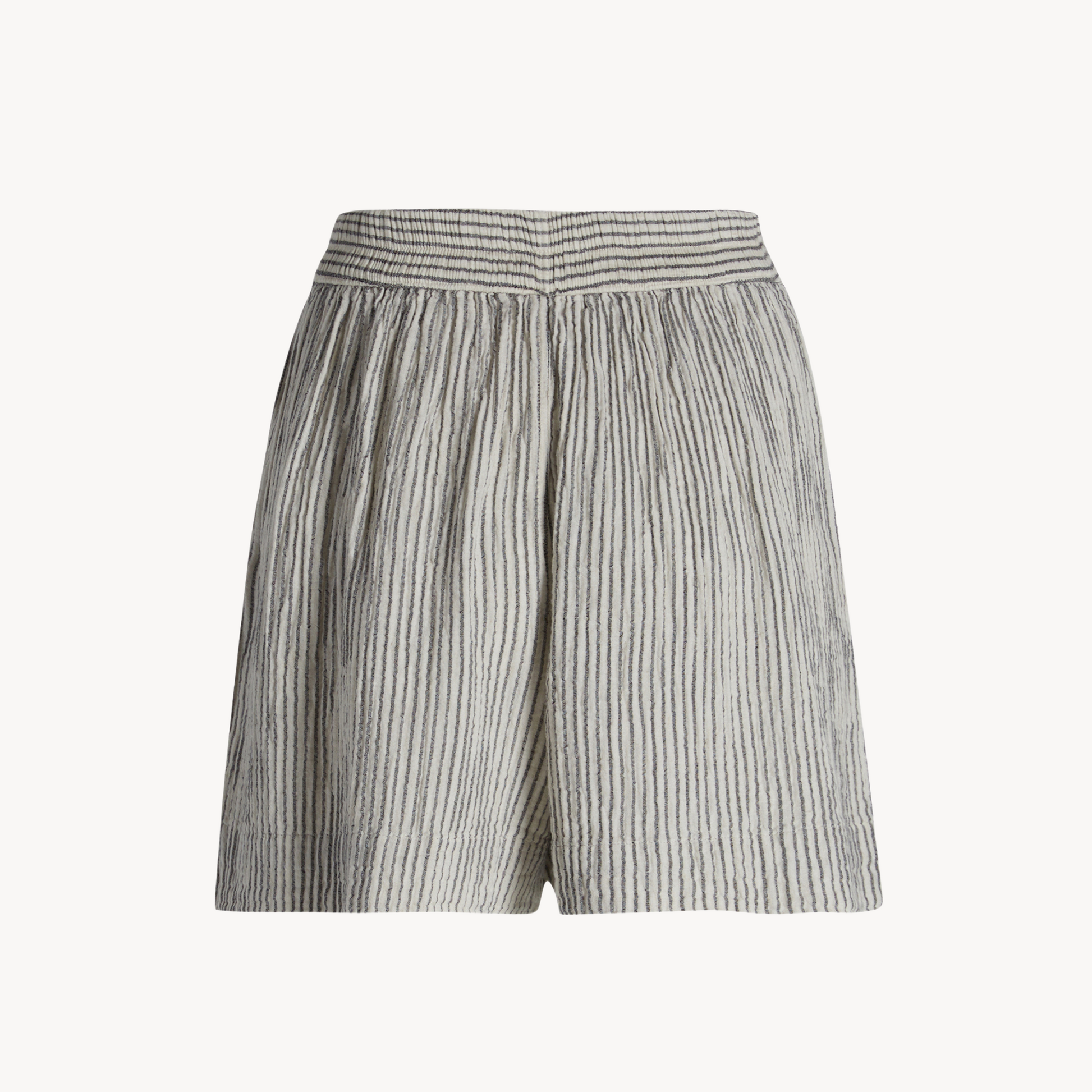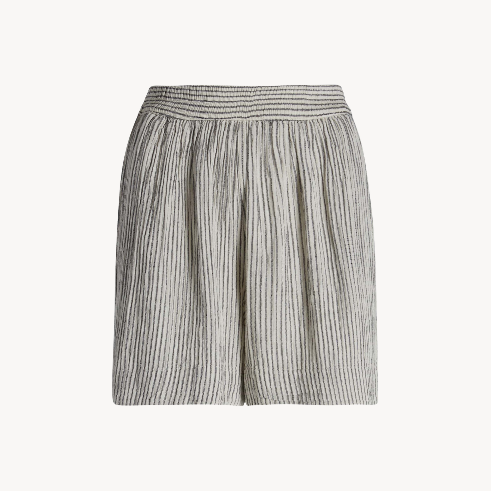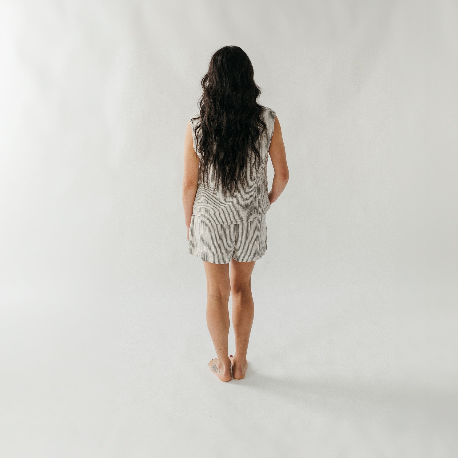 The Crinkle Cotton shorts are loose-fitting lounge shorts with elasticated high waist to accentuate your natural waist, inline pockets on each side, and the shorts' hem lands at mid-thigh.