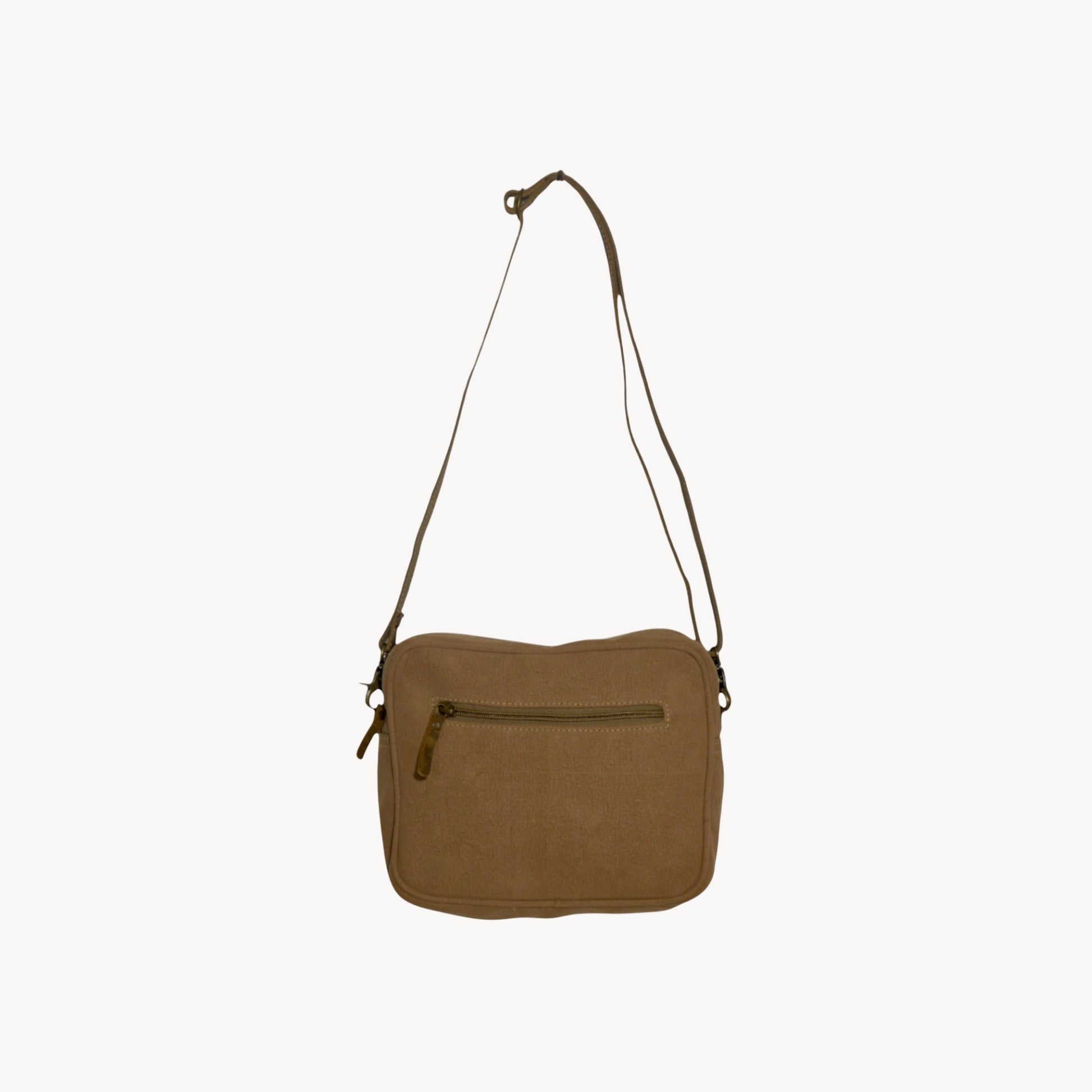 This retro-style handmade bag is crafted with mixed materials including cotton rug, upcycled canvas and repurposed leather - a stylish yet conscious statement piece.